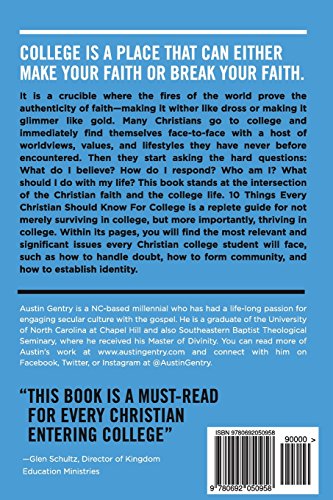 College is a place that can either make your faith or break your faith. It is a crucible where the fires of the world prove a faith’s authenticity–making it wither like dross or glimmer like gold. Many Christians go to college and immediately find themselves face-to-face with a host of worldviews, values, and lifestyles they have never before encountered. Then they start asking the hard questions: What do I believe? How do I respond? Who am I? What should I do with my life? This book stands at the intersection of the Christian faith and the college life. 10 Things Every Christian Should Know For College is a student’s guide for not merely surviving in college, but thriving. Within its pages, you will find the most relevant and significant issues every Christian college student will face, such as how to handle doubt, how to form community, and how to establish a gospel-centered identity.