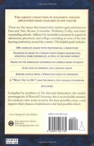 The largest collection of successful college application essays available in one volume. These are the essays that helped their authors gain admission to Harvard, Yale, Brown, Columbia, Wellesley, Colby, and other outstanding schools–followed by invaluable comments by experts in admissions, placement, and college counseling at some of the best learning institutions around the country. This helpful guide includes: 100 complete essays with professional commentary Examples of essays on common topics (family background, athletics, work experience), as well as the more offbeat Essays on the immigrant experience by foreign-born students A section of drawing and cartoon essays Insider advice from a Princeton dean of admissions A “What Not to Do” chapter from a top college counselor And more Compiled by members from The Harvard Independent, the weekly newsmagazine of Harvard University, this is an invaluable resource for students who want to write the best possible essay–and improve their chances of admission to the best possible school.