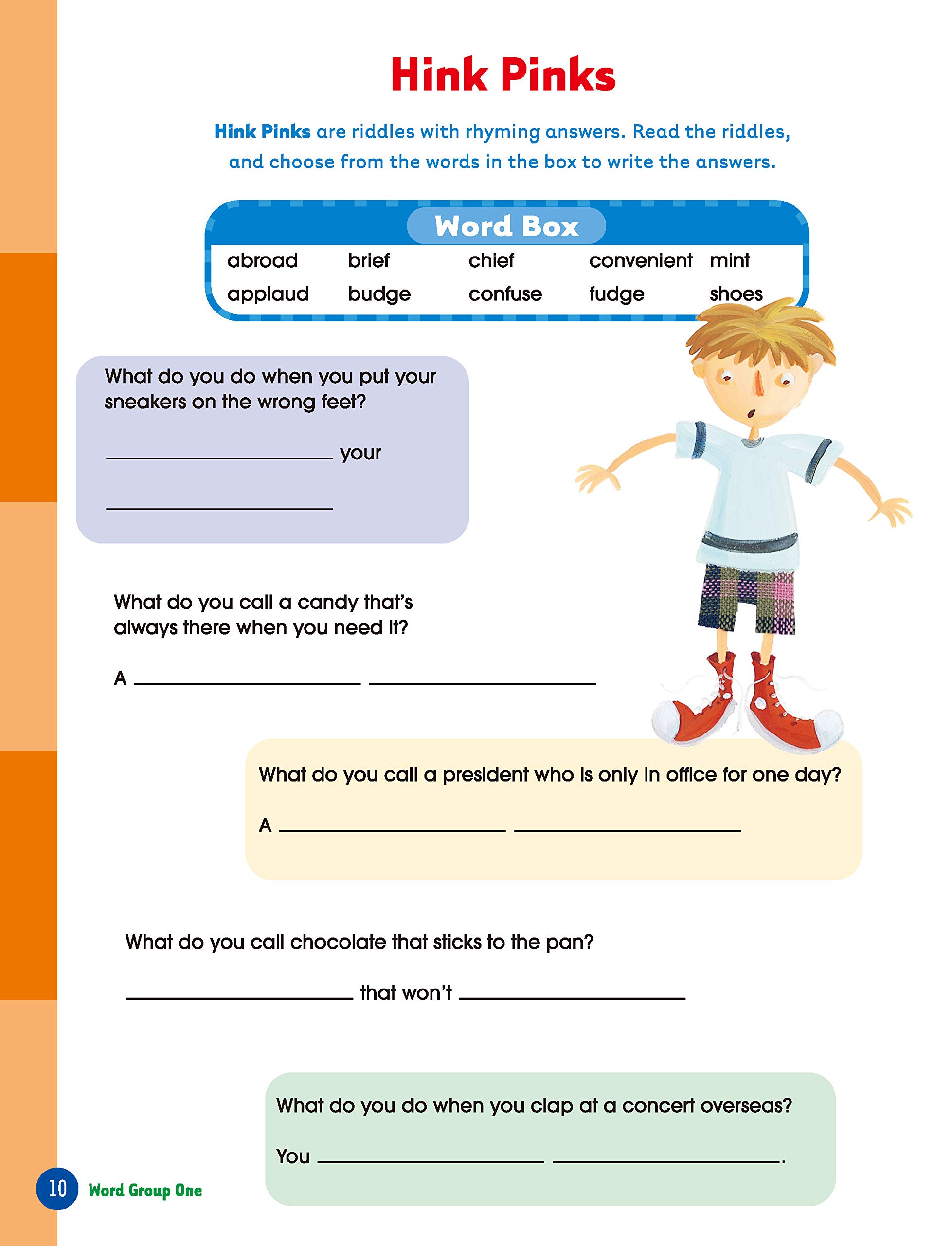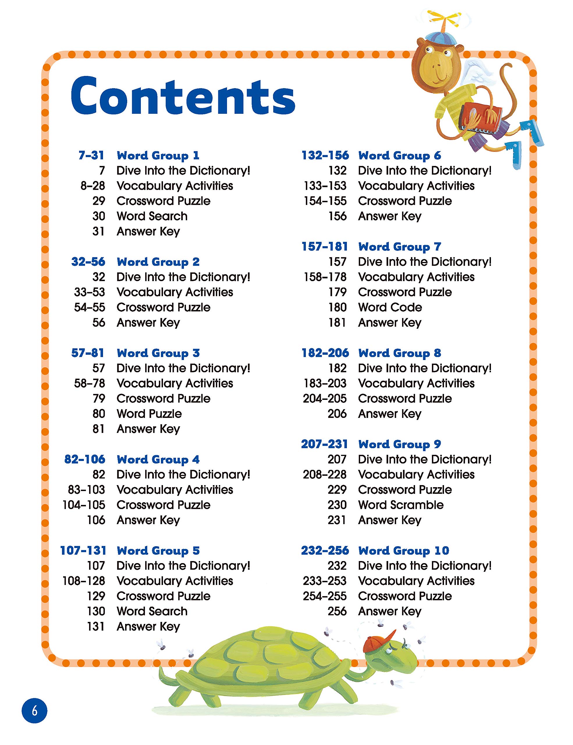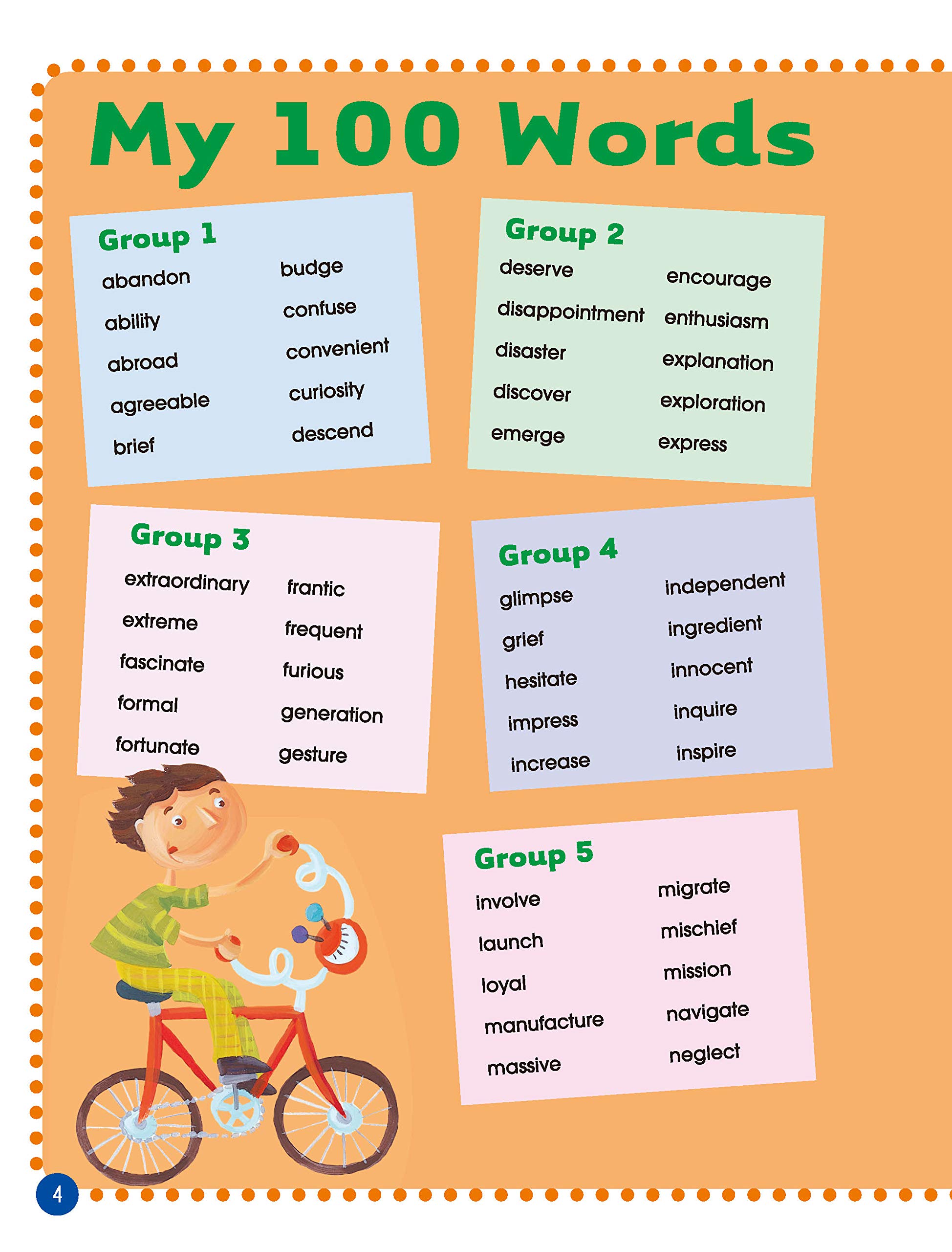 A colorful, engaging, FUN language arts workbook that gives fourth graders important vocabulary-building practice. Continuing the successful Scholastic “100 Words”line of exciting new language arts workbooks, this product focuses on 100 essential words kids need to know by 4th grade. Colorful art and photographs illustrate the 256 pages of lively activities, including reading and writing practice, comprehension, critical thinking exercises and word puzzles. Includes special dictionary pages and dictionary skill tips and colorful bookmarks with vocabulary-building tips.