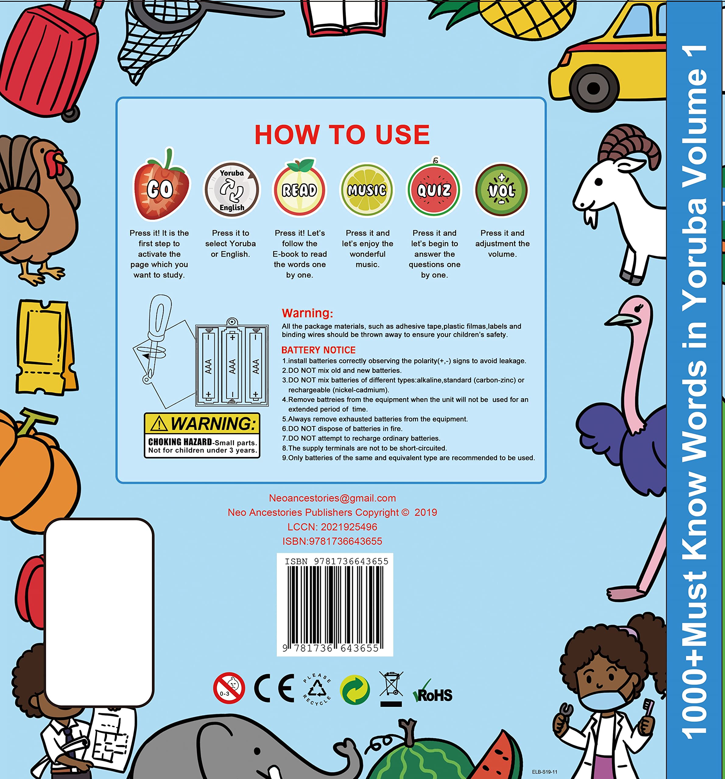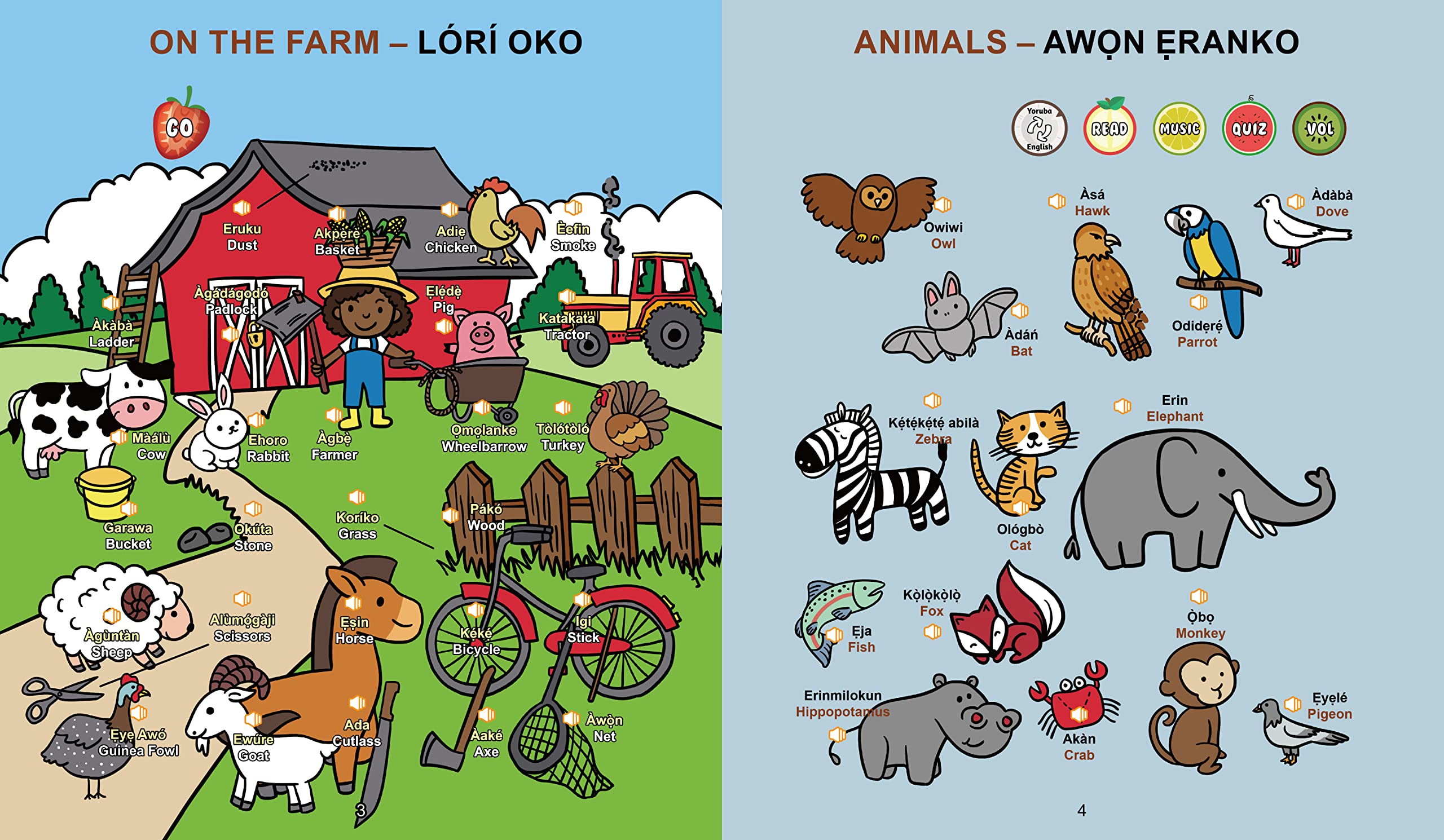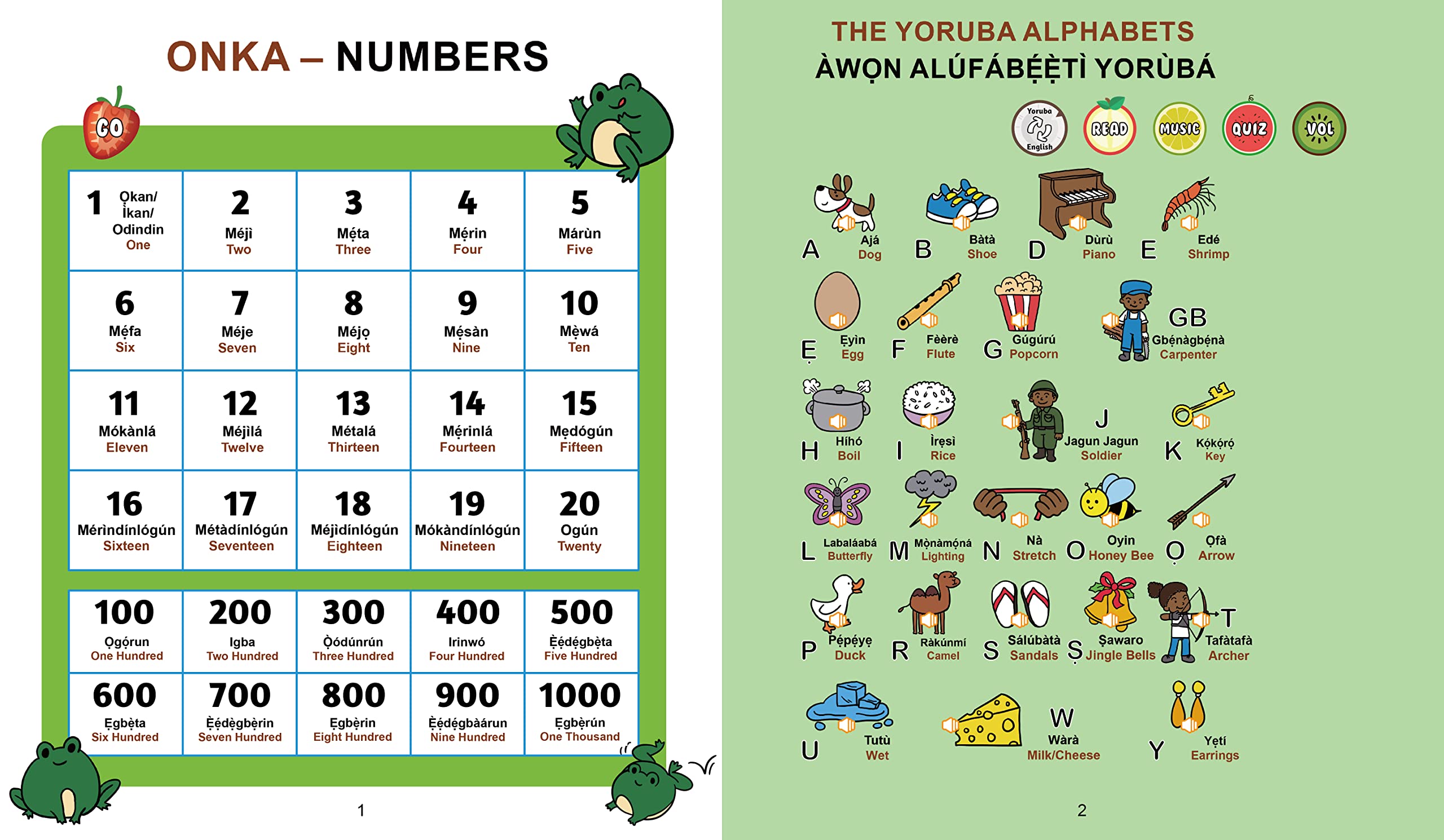 - THIS BOOL TALKS! Revolutionary paper electronic innovation allows kids to simply touch the paper pages of this The book contains over 1000+ words derived from the language of Yoruba from Nigeria. You get to press each button and it tells you what the word is in correct Yoruba intonation and pronunciation Book has Occupations, Cardinal points, Days of the week, Months of the Year, Seasons, Colo(u)rs, Numbers, Alphabets, Animals, Vegetables, Fruits, Commands, Postures, Members of the Sky and more