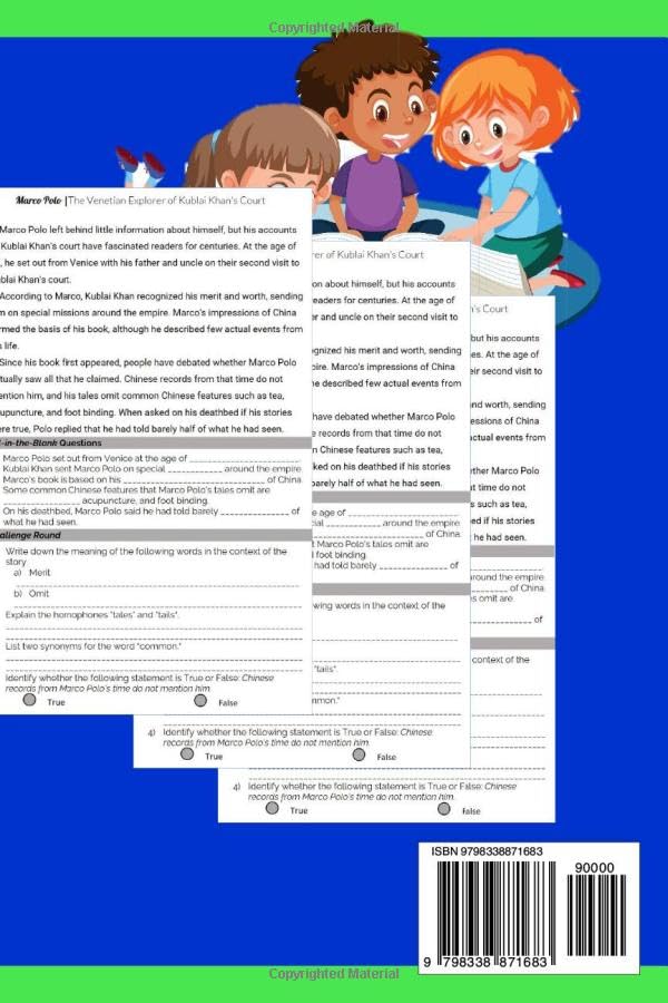 Is your 5th grader ready to become a reading superstar? Discover the ultimate tool to skyrocket their comprehension skills! Introducing “111 Reading Comprehension Passages for 5th Grade” – the game-changing workbook that transforms struggling readers into confident learners. Perfect for kids ages 10 and up, this captivating collection of short, non-fiction stories will have your child begging for “just one more passage!” Why choose this workbook? 111 engaging passages about history’s greatest figures Fun exercises that feel like games, not homework Build vocabulary without boredom Boosts critical thinking skills for success in all subjects Parent-friendly guide for easy at-home support But that’s not all! This isn’t your average reading workbook. Here’s what sets it apart: Time-travel through history with fascinating true stories Master tricky word skills like antonyms, synonyms, and homophones Conquer multiple-choice, fill-in-the-blank, and true/false questions Develop crucial inferencing abilities Learn to spot facts vs. opinions like a pro Face the “Challenge Round” for an extra brain boost! Fretting about your child’s reading progress? Don’t. In just minutes a day, you’ll see: Improved test scores across all subjects Growing confidence in independent reading A newfound love of learning Less stress over homework and assignments Don’t let reading struggles hold your child back. Give them the tools to succeed in school and beyond. Click “Add to Cart” now and watch your 5th grader’s reading skills soar! P.S.: With an easy-to-use answer key, you’ll be the perfect study friend. Helpful Details for Parents and Teachers 1. Do passages increase in difficulty level? Absolutely! Each passage is thoughtfully arranged to gradually challenge your child as they progress, building their confidence step by step. We understand that keeping engagement high while ensuring steady progress is key to real learning. By advancing in complexity, this workbook helps your child master reading comprehension skills without feeling overwhelmed. 2. Are passages aligned to 5th grade standards? Yes, they are! Each passage and question is designed with 5th-grade standards in mind, focusing on age-appropriate vocabulary, sentence structure, and comprehension skills. This alignment ensures that your child is not only practicing but also reinforcing skills needed to excel at this grade level. Plus, you’ll see a real impact on their school performance and confidence. 3. Does it cover different genres or topics? Variety is at the heart of this workbook! From inspiring historical figures to fascinating scientific concepts, each passage invites your child into a new world. This diverse range of topics keeps them engaged while exposing them to various writing styles and genres, which is essential for well-rounded comprehension skills. 4. Is it suitable for advanced 4th graders? Yes, advanced 4th graders will thrive with this workbook! If your 4th grader is ready for a challenge, these passages will be the perfect tool to stretch their abilities and boost their reading confidence. The exercises encourage critical thinking and make for a fantastic preparatory resource for 5th-grade reading standards. 5. Are answers provided for the exercises? Yes, every exercise comes with a clear answer key! We know how valuable it is for parents and kids to have guidance, so we included an easy-to-use answer section. This makes it simple for you to help your child check their work and learn from any mistakes along the way. It’s like having a helpful guide right at your side!