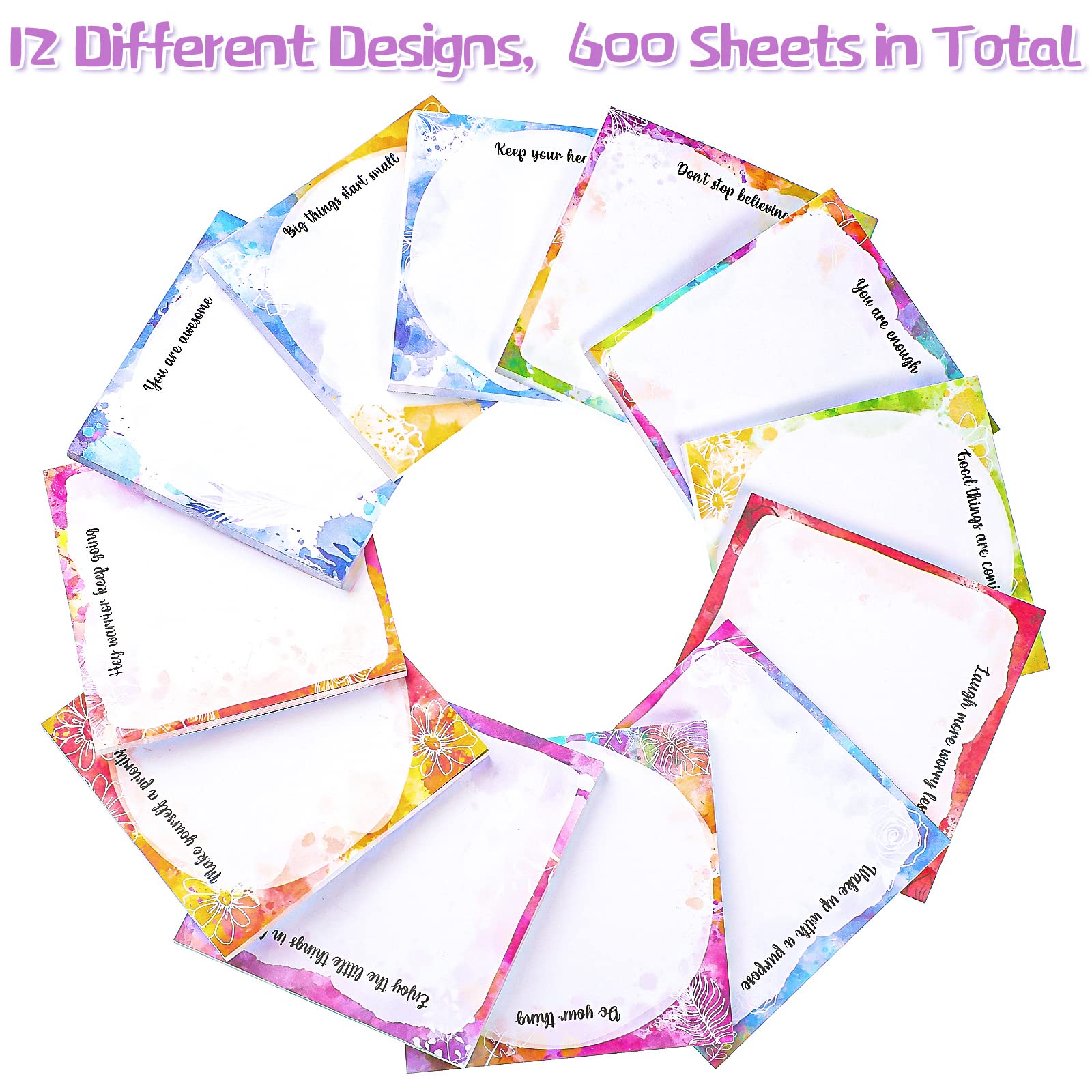 • The package includes:contain 12 books of different watercolor colors, motivational note papers printed with 12 motivational sentences, 50 sheets per sheet, 600 sheets in total, sufficient quantity and diverse styles to meet your needs for different occasions