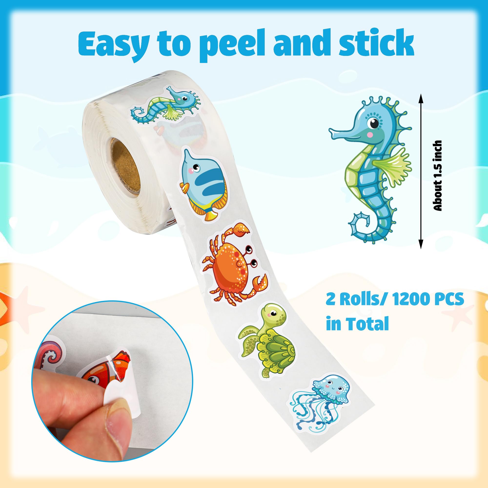 1200 PCS Ocean Animal Stickers Roll Cartoon Sea Life Sticker Fish Sticker Deals Sea Creature Labels for Ocean Theme Party Favors Classroom Teacher Rewards, 2 Roll