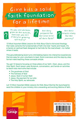 The number #1 cry of children’s ministry leaders everywhere is the desire to teach kids the basics–the foundational truths of the Christian faith. With the 13 Most Important Bible Lessons series, you’ll give kids a faith foundation that will last a lifetime and prepare them for a lifetime of spiritual maturity. This series offers kids’ Bible lessons that prepare upper-elementary school kids to weather the storms of life with a strong spiritual base. This children’s ministry resource not only gives children a solid understanding of their faith, it also equips their teachers to tackle the tough questions that inevitably arise. Teach your children practical Bible lessons that will establish a solid footing to help them deal with the challenges of growing up while also growing in their faith and their Christian beliefs. Each Most Important Bible Lesson is designed for kids age 8 through 12, and includes: Lesson at glance Opener Scripture foundations Relational applications Closing prayer Give your kids a firm hold of God’s truth with 13 Most Important Bible Lessons for Kids about God. You get 13 lessons focusing on the three pillars of our faith: God, Jesus and the Holy Spirit. Your volunteers will be equipped to teach kids vital truths that include: The goodness of God The holiness of God Jesus, God in human flesh Jesus, the payment for our sins The Holy Spirit, our advocate 13 Most Important Bible Series offers three volumes: 13 Most Important Bible Lessons for Kids about God (9780764470660) 13 Most Important Bible Lessons for Kids About Living for Jesus (9781470704278) 13 Most Important Bible Lessons for Kids About Loving Each Other (9781470715236)