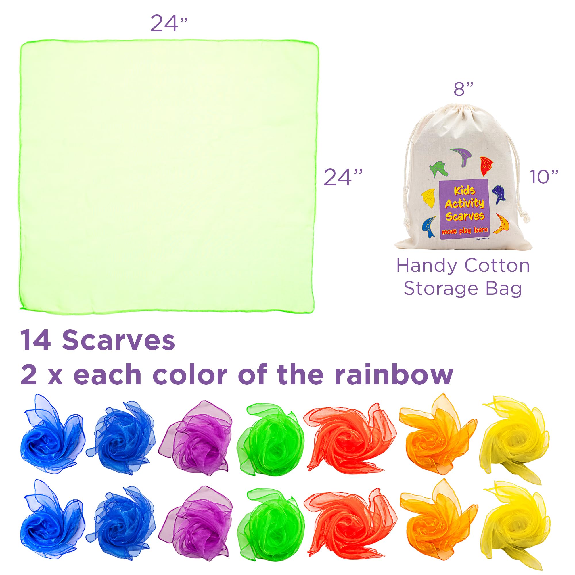 - Versatile & easy to store: These play scarves are as practical as they are fun. Featuring 14 bright dancing scarves for kids, this set comes with a handy cotton storage bag for easy cleanup and portability. Whether you’re at home, in the classroom, at daycare, or traveling, this set of scarves bulk is the ultimate tool for portable movement-based learning and play.