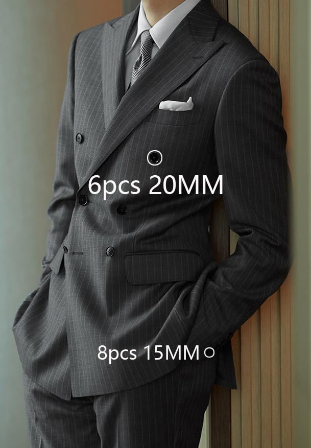 Mixed set: 8pcs 15mm Diamater for sleeves, 6pcs 20mm Diameter for front, 14pcs were enough for 1 tailored double breasted blazer replacement.