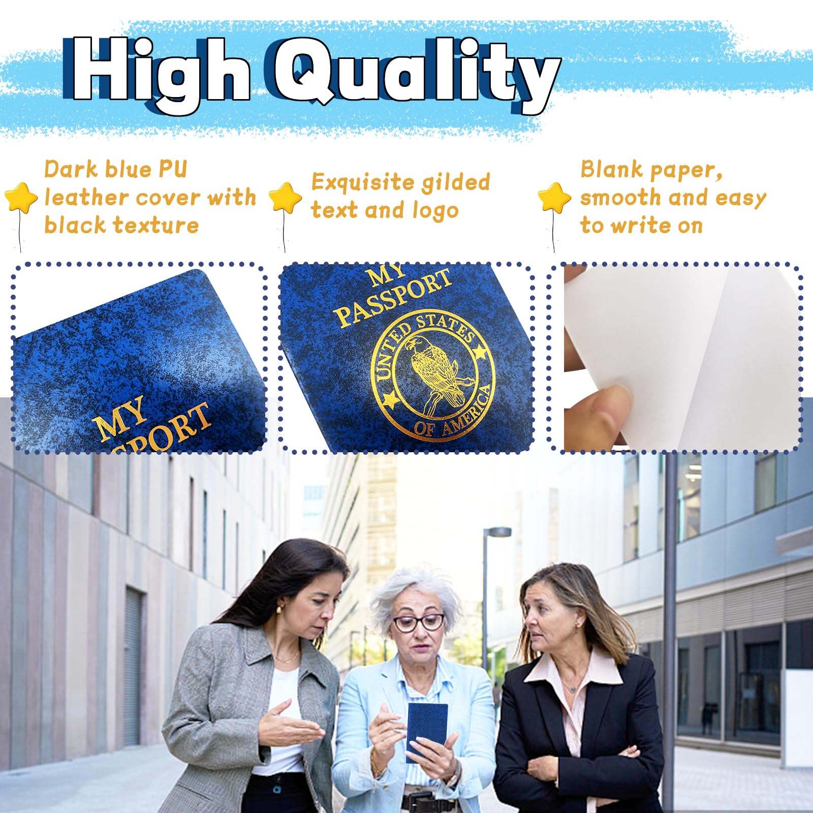 • High Quality:Bulk blue fake passport has a dark blue PU leather cover with black texture.The blank inner pages are made of reliable paper,white and smooth,not easy to tear,providing you with a comfortable writing experience.