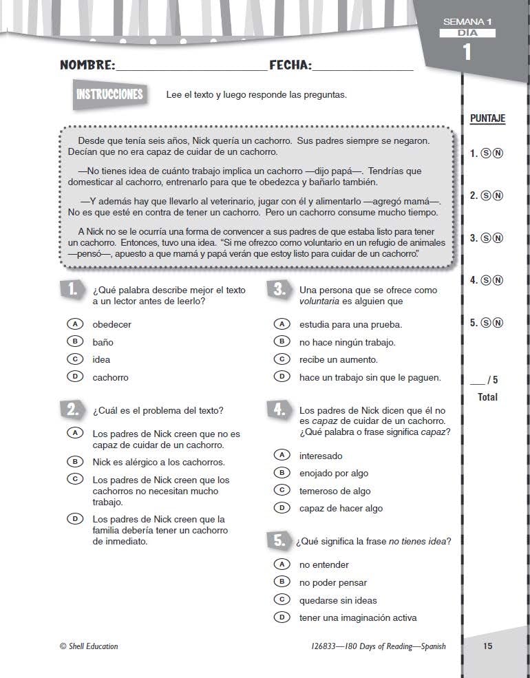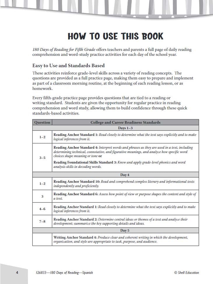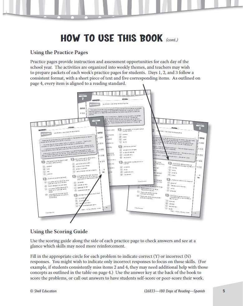 !Aprende durante 180 di?as! Help Spanish-speaking fifth grade students improve their reading skills with meaningful and fun daily practice activities. 180 Days: Reading (Spanish): Uses short, interesting Spanish passages to help students practice reading comprehension, word study, and written responses Builds student confidence in reading with independent learning activities that focus on comprehension and fluency skills Supports Spanish speakers in at-home learning or small group instruction Includes standards-based activities, easy-to-follow instructions, and an answer key to quickly assess student understanding Parents appreciate this easy-to-use activity book that keeps their child invested in learning. The product is teacher-approved and perfect for homeschooling, to reinforce learning at school, or to overcome learning loss. Teachers rely on the daily practice workbooks to reach English learners. The ready-to-implement activities are ideal for tracking progress and engaging students. Additionally, the activities can be used for intervention skill building to address learning gaps.