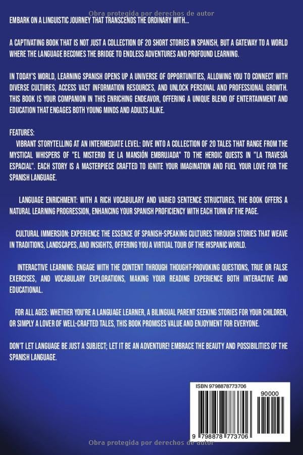 Embark on a linguistic journey that transcends the ordinary with… A captivating book that is not just a collection of 20 short stories in Spanish, but a gateway to a world where the language becomes the bridge to endless adventures and profound learning. In today’s world, learning Spanish opens up a universe of opportunities, allowing you to connect with diverse cultures, access vast information resources, and unlock personal and professional growth. This book is your companion in this enriching endeavor, offering a unique blend of entertainment and education that engages both young minds and adults alike. Features: Vibrant Storytelling at an Intermediate Level: Dive into a collection of 20 tales that range from the mystical whispers of “El Misterio de la Mansion Embrujada” to the heroic quests in “La Travesia Espacial”. Each story is a masterpiece crafted to ignite your imagination and fuel your love for the Spanish language. Language Enrichment: With a rich vocabulary and varied sentence structures, the book offers a natural learning progression, enhancing your Spanish proficiency with each turn of the page. Cultural Immersion: Experience the essence of Spanish-speaking cultures through stories that weave in traditions, landscapes, and insights, offering you a virtual tour of the Hispanic world. Interactive Learning: Engage with the content through thought-provoking questions, true or false exercises, and vocabulary explorations, making your reading experience both interactive and educational. For All Ages: Whether you’re a language learner, a bilingual parent seeking stories for your children, or simply a lover of well-crafted tales, this book promises value and enjoyment for everyone. But, that’s not all… When you download the translations, you will also gain access to an exclusive 5-day Spanish course that covers the fundamentals of the Spanish language. This course is designed to provide you with a strong foundation in Spanish, making it easier to follow along with the stories in the book. Join us and start your journey to mastering Spanish today! Don’t let language be just a subject; let it be an adventure! Embrace the beauty and possibilities of the Spanish language. Your journey into the richness of Spanish storytelling awaits. Get your copy, and transform your language learning into an unforgettable voyage of discovery. !Vamos!