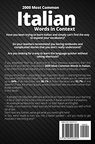 Have you been trying to learn Italian and simply can’t find the way to expand your vocabulary? Do your teachers recommend you boring textbooks and complicated stories that you don’t really understand? Are you looking for a way to learn the language quicker without taking shortcuts? If you answered “Yes!” to at least one of those previous questions, then this book is for you! We’ve compiled the 2000 Most Common Words in Italian, a list of terms that will expand your vocabulary to levels previously unseen. Did you know that — according to an important study — learning the top two thousand (2000) most frequently used words will enable you to understand up to 84% of all non-fiction and 86.1% of fiction literature and 92.7% of oral speech? Those are amazing stats, and this book will take you even further than those numbers! In this book: A detailed introduction with tips and tricks on how to improve your learning A list of 2000 of the most common words in Italian and their translations An example sentence for each word – in both Italian and English Finally, a conclusion to make sure you’ve learned and supply you with a final list of tips Don’t look any further, we’ve got what you need right here! In fact, we’re ready to turn you into a Italian speaker… are you ready to get involved in becoming one?