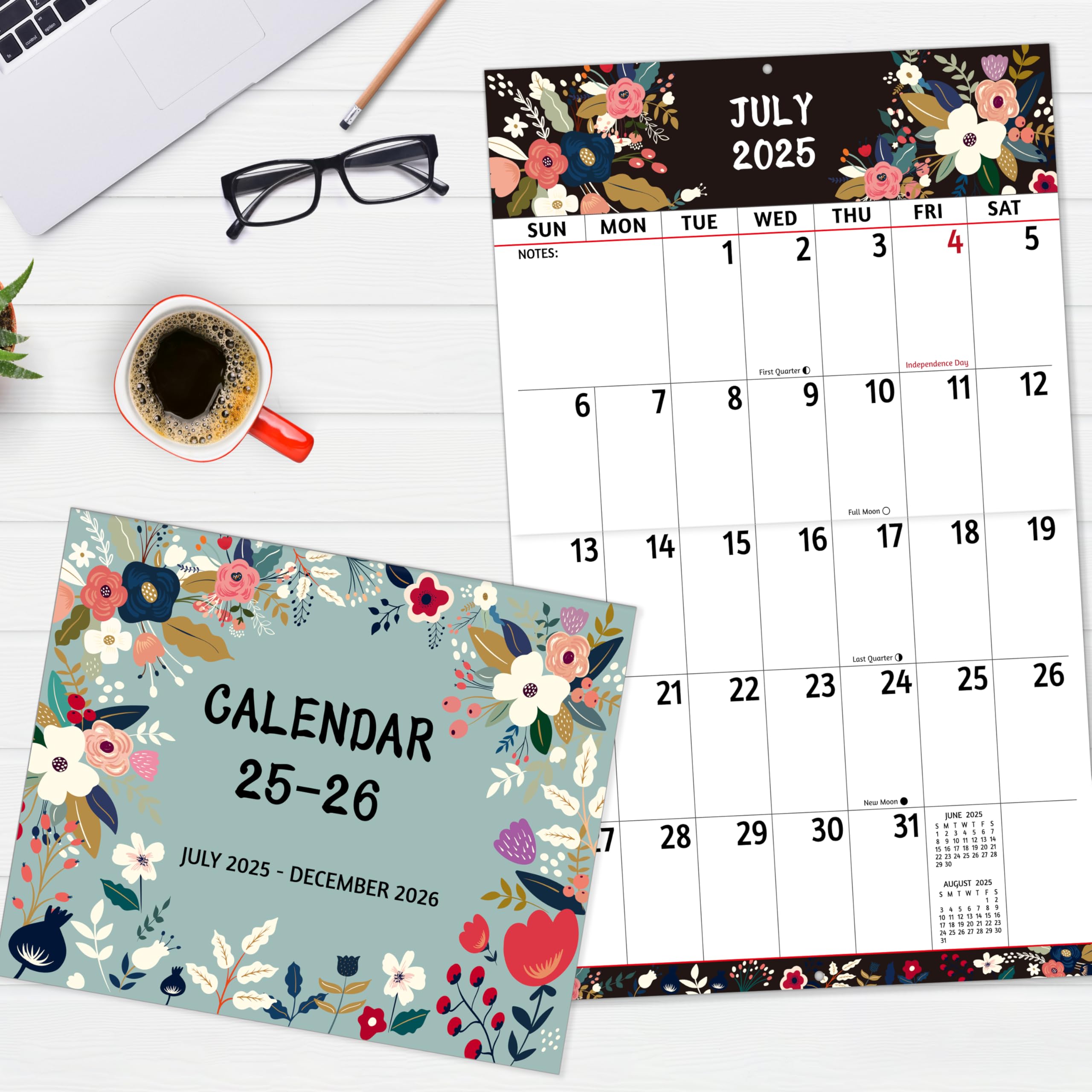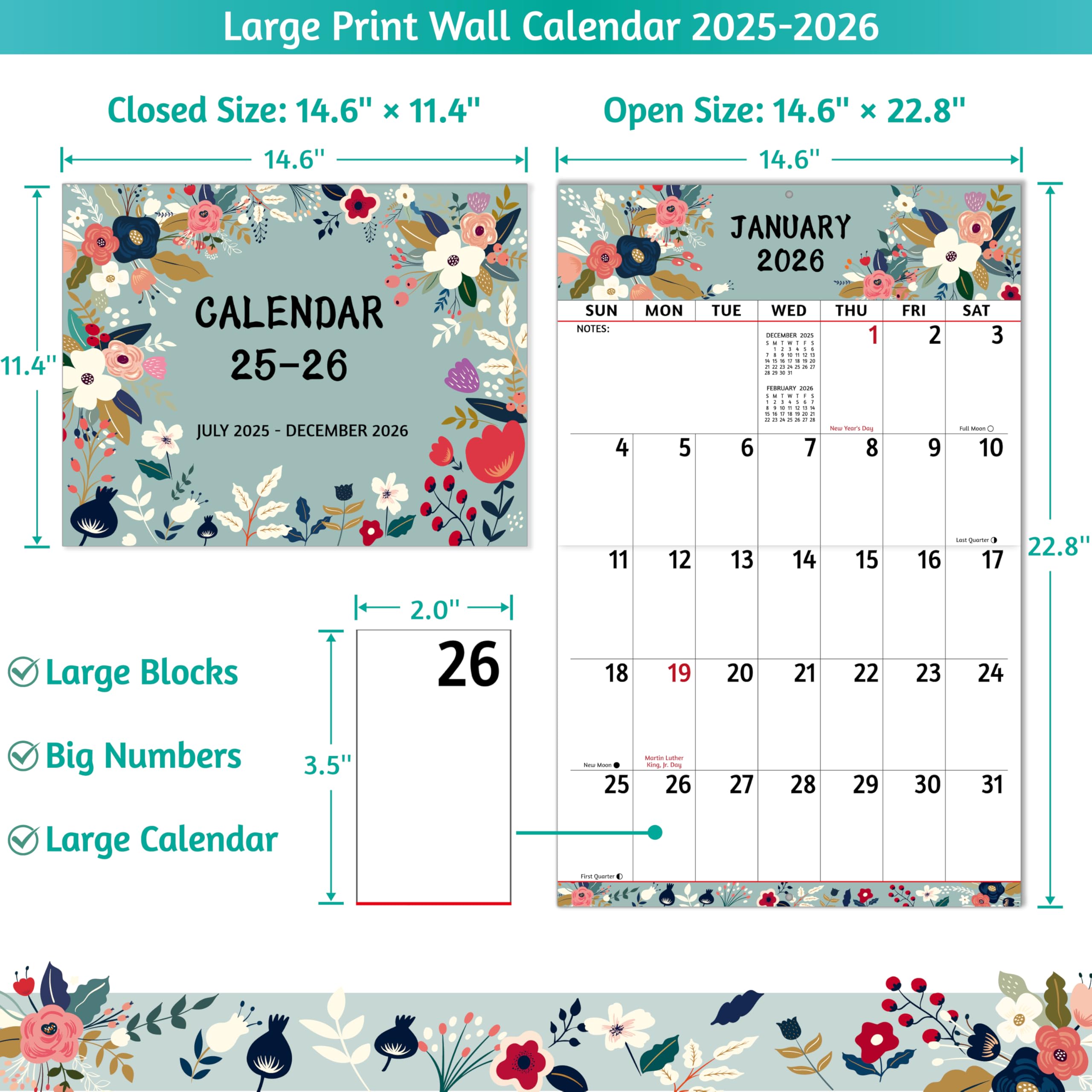 - 2025-2026 WALL CALENDAR – July 2025 – December 2026 (14.6” x 22.8” Open), this large calendar 2025-2026 covers 18 month calendar for an easier year-round planning. Plan ahead and manage your life more efficiently with large print calendar!