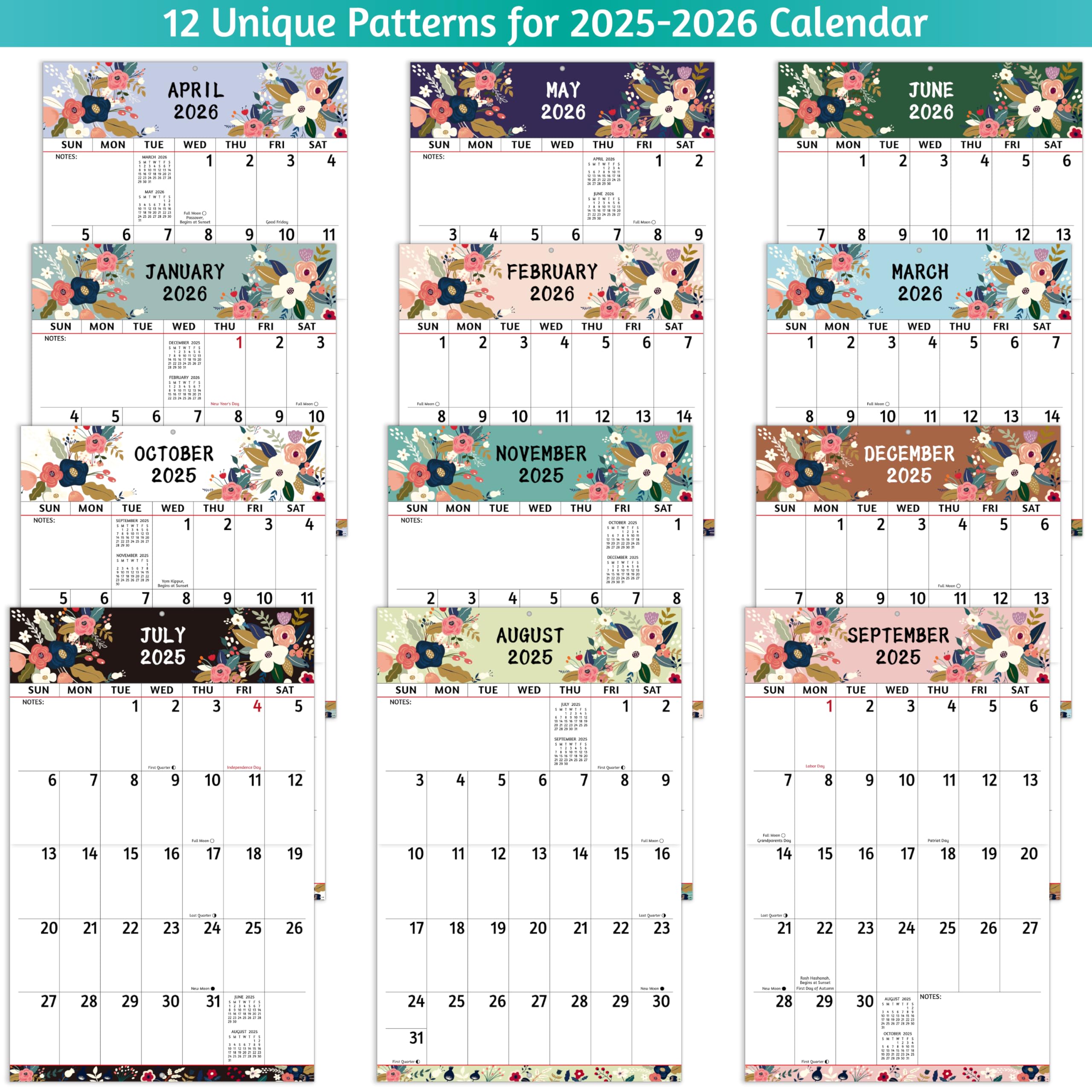 - BEAUTIFUL FLOWERS PATTERNS – This wall calendars 2025-2026 has 18 different flowers background, clearly printed on glossy smooth paper, very beautiful and vivid. Plus, each month there are 4 main moon phase marked, very useful.