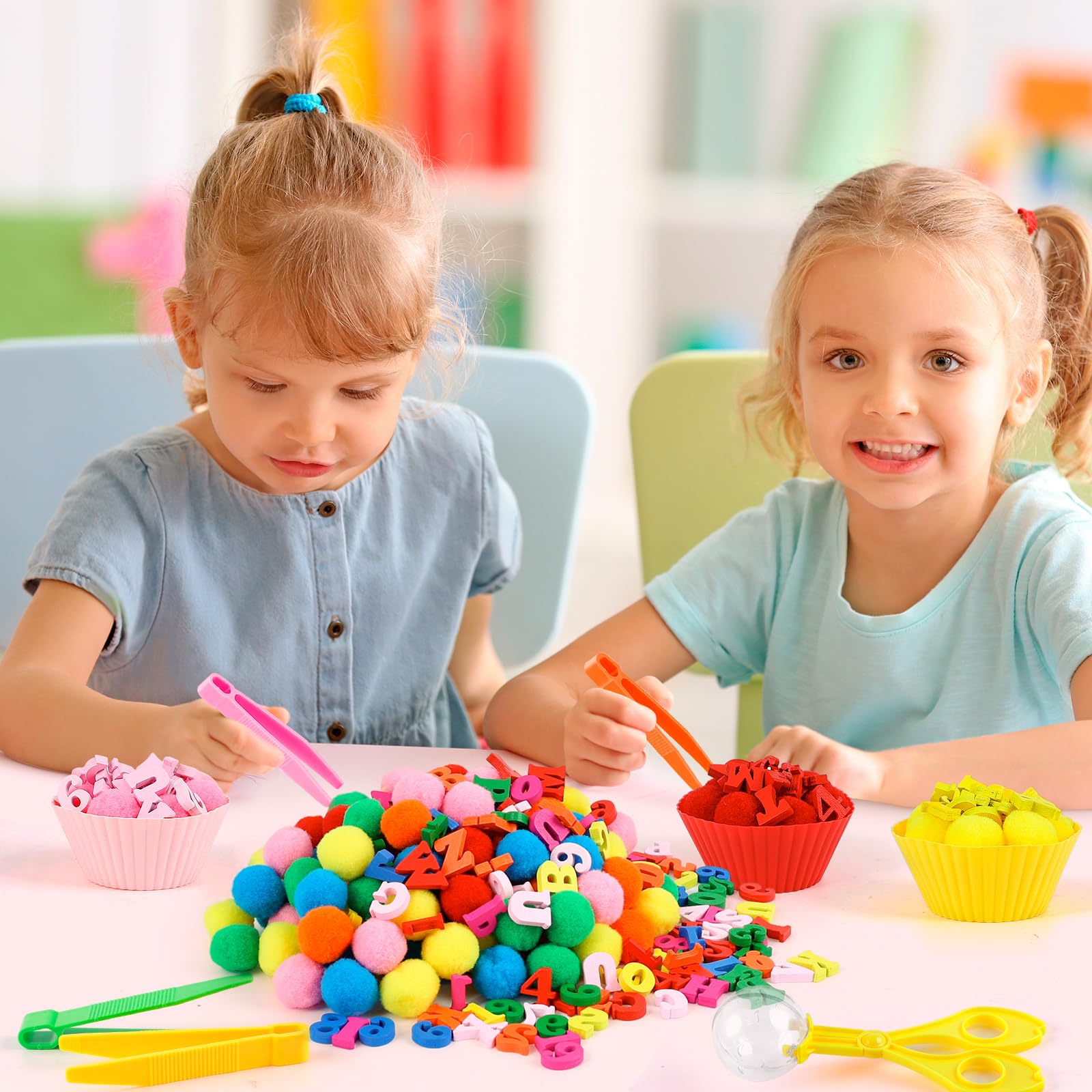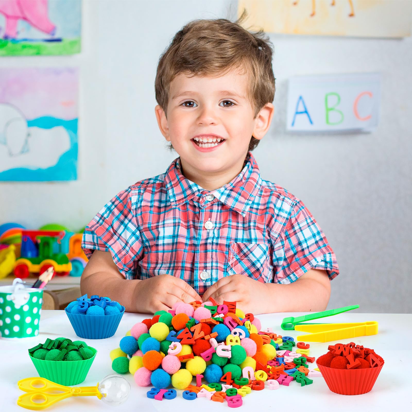 231 Pcs Letters and Numbers Sensory Bin Filler Fine Motor Toys Sensory Bin Filler 100 Pompoms 100 Wooden Letters and Numbers 14 Cups 4 Tweezers 2 Scissors Storage Box for Sorting Counting Training