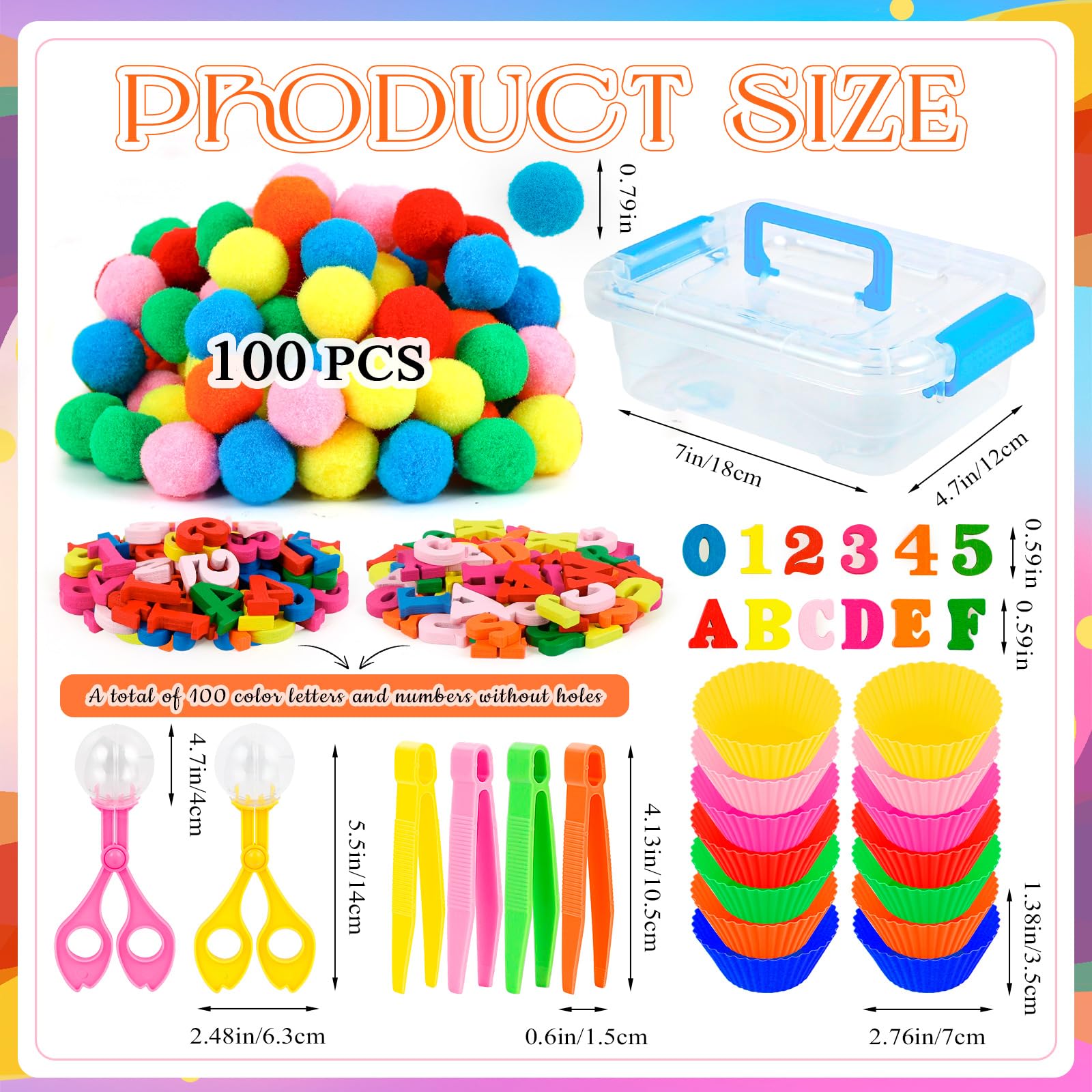 • Counting Sorting Toys Decorations: you will receive 100 pcs pom poms, 100 pcs of wooden letters and numbers, 2 pcs of scissors clips, 4 pcs of plastic tweezers, 14 pcs of sorting cups, 1 piece of storage bin with lid, 132 pieces in total, sufficient quantity to meet your use