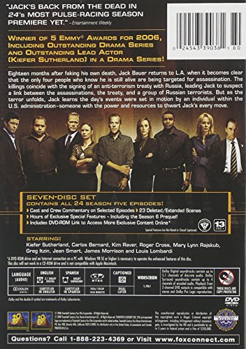 Amazon.com Arguably the series’ best season to date, season 5 of 24 literally starts with a bang and never lets up, with an intricate executive-level conspiracy to control Central Asia’s oil supply. Piling crisis upon crisis in an escalating series of deceptions, twists, and deeply hidden agendas, the day-long ordeal begins with a devastating political assassination connected to a disgraced former CTU agent (Peter Weller) and a radical group of Russian separatists (led by British actor Julian Sands) threatening to release lethal nerve gas in Los Angeles to protest a U.S./Russian treaty about to be signed by President Charles Logan (Gregory Itzin). As Logan’s unstable wife Martha (Jean Smart), Secret Service agent Aaron Pierce (Glenn Morshower), and chief of staff Mike Novick (Jude Ciccolella) gradually uncover the conspiracy, CTU maverick Jack Bauer (series star Kiefer Sutherland) emerges from self-imposed exile to aid his CTU colleagues in a life-threatening quest for the truth. Meanwhile, CTU chief Bill Buchanan (James Morrison) is thwarted by an inexperienced, overbearing superior (Sean Astin) and an executive takeover of CTU led by Homeland Security chief Karen Hayes (Jayne Atkinson), forcing Bauer and his CTU loyalists to “go dark” and work independently to honor the memory of a slain friend and leader. Also figuring in are CTU’s resident hacker-nerd extraordinaire, Chloe O’Brian (played to perfection by Mary Lynn Rajskub), Bauer’s estranged daughter (Elisha Cuthbert), and his beloved CTU colleague Audrey Raines (Kim Raver). Pivoting on a declaration of martial law and a mysterious cabal of unnamed conspirators, “Day 5” shocked even loyal 24 fans with a high body count including several important supporting characters. It all adds up to an exceptional season that earned Sutherland a well-deserved Emmy (for Outstanding Lead Actor in a Drama Series), equally deserving Emmy nominations for Itzin and Sharp, and an Emmy win for co-executive producer Jon Cassar’s direction of the riveting season premiere. And while the breathtaking twists of 24 don’t always hold up to intense scrutiny, these 24 episodes (running about 43 minutes each) are tightly written and flawlessly directed with an involving emphasis on thriller plotting and dramatic focus on the complex and operatically tragic relationship between President Logan and his traumatized wife. Add it all up, and you’ve got an addictive reason to look forward to season 6. –Jeff Shannon On the DVDs Discs 1-6 contain four episodes each, with several episodes including optional viewing of extended or alternate takes of selected scenes. A total of 12 full-length episode commentaries are provided by 24’s primary cast and crew, allowing listeners a comprehensive appreciation of the series’ extended “family” of talent, along with a wealth of production anecdotes, revealing observations about plotting and character, and a welcome overview of individual personalities and contributions. Disc 7 is packed with features, beginning with a season 6 prequel that offers a tantalizing glimpse of things to come, with an interrogation and escape scenario set seven months after the events of “Day 5”; by comparison, the season 6 trailer offers little more than a recap of season 5. The featurettes are all well-crafted and worth a look, beginning with a “Supporting Players” profile of 24’s extended cast (including some surprising glimpses of their off-screen hobbies and activities); a detailed documentary about 24’s innovative and hard-working camera crew; a profile of music composer Sean Callery, who demonstrates his versatile mood-setting techniques; a detailed exploration of the “Presidential Retreat” set with production designer Jonathan Hodges and colleagues; a “100th Episode Reel” with tightly-edited clips from seasons 1-5; and a sampling of cast and crew photos from 24: Behind the Scenes, a picture book published in November 2006. Kudos to Sparkhill Productions for continuing to provide 24 bonus features as well-made as the series itself. –Jeff Shannon Beyond 24: Season 5 Stills from 24: Season 5 Product Description The 7-disc boxed set contains 4 episodes on each disc with a disc full of bonus features including extended and deleted scenes and webcast diaries.