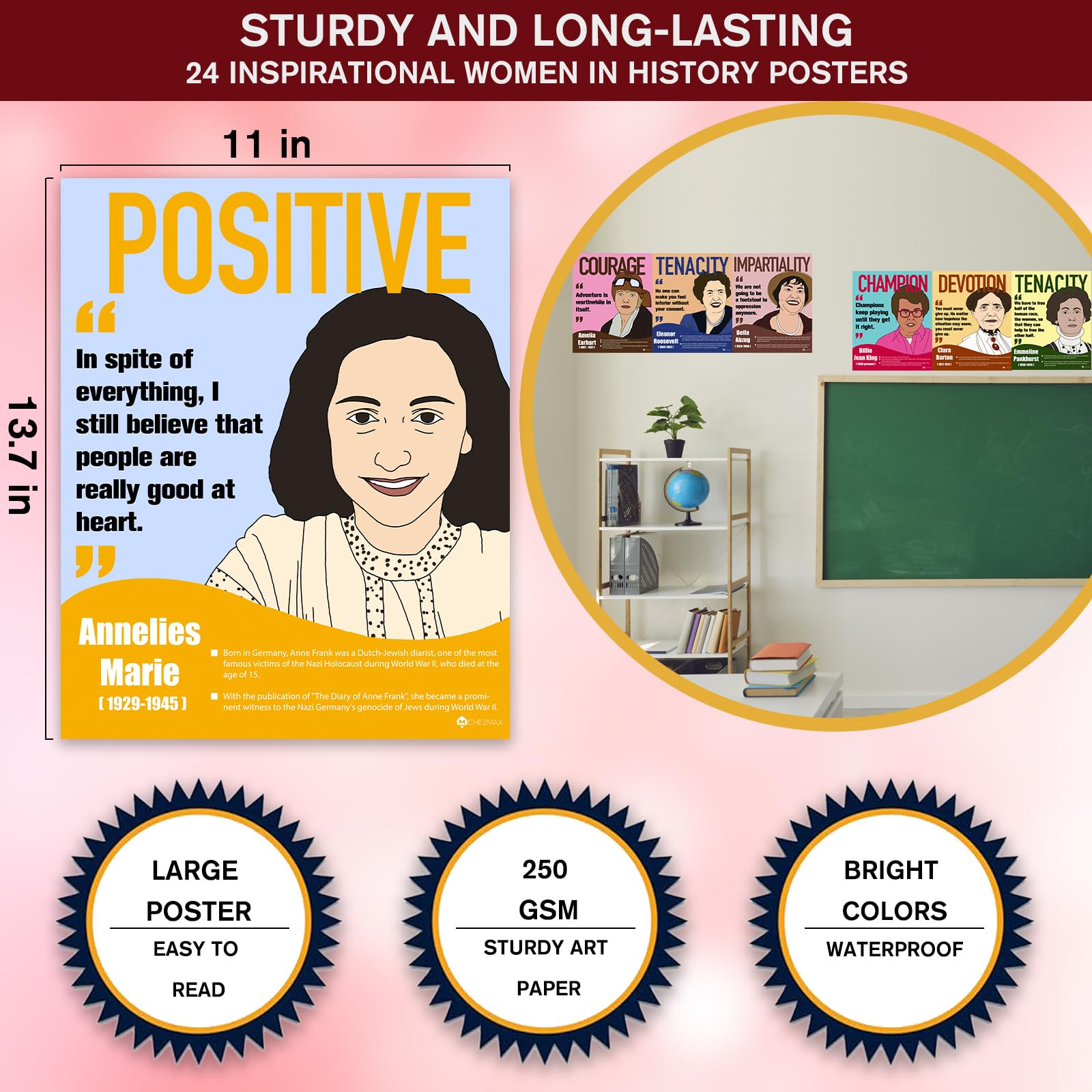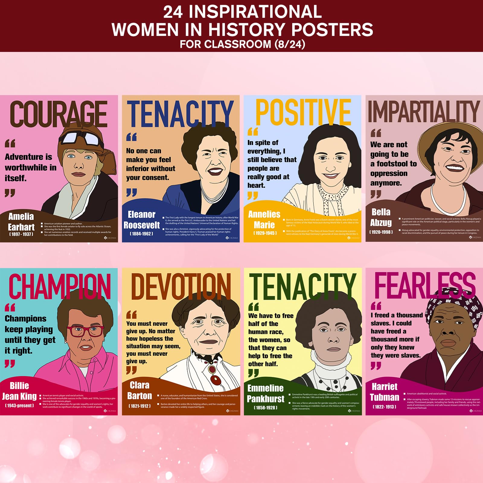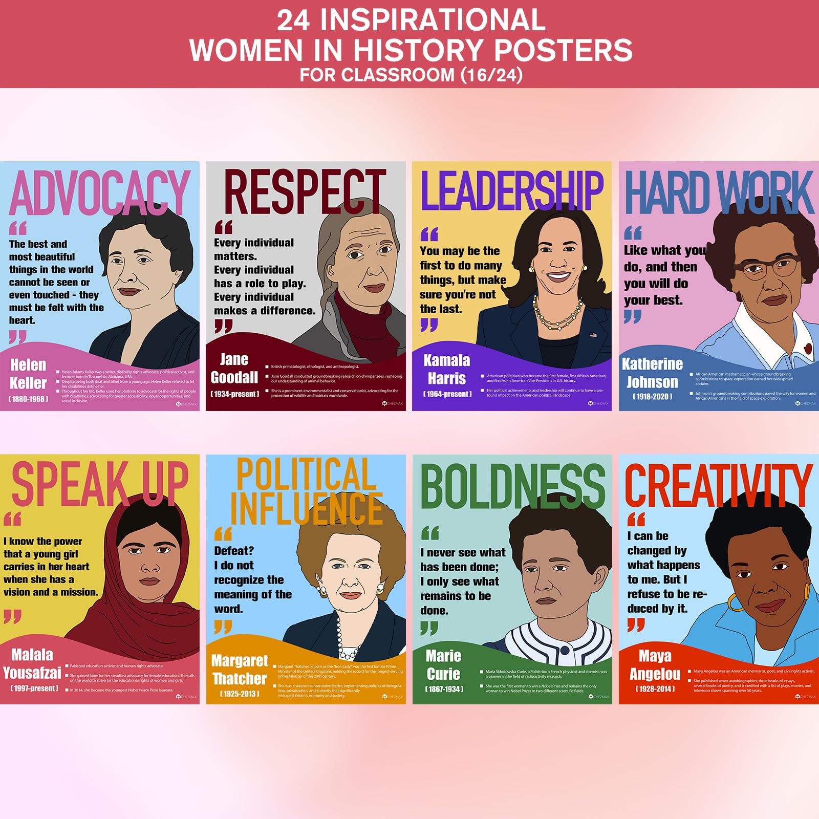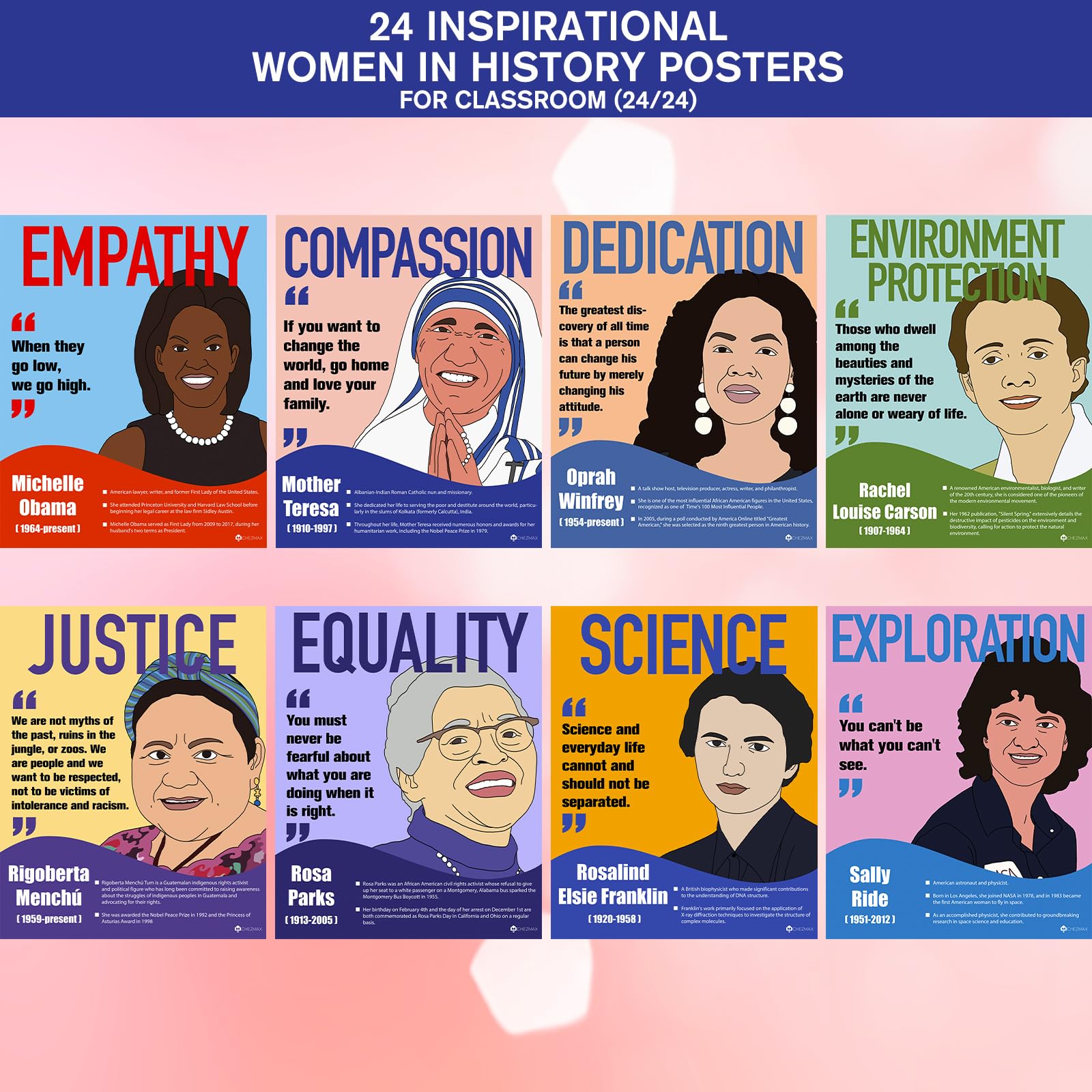 - INSPIRATIONAL 24 WOMEN IN HISTORY POSTERS FOR CLASSROOM: The posters come with a pre-laminated, waterproof surface, so no additional lamination is required. They can be used as self-adhesive or mounted with nails. Dive into the past with our collection of 24 captivating women’s history posters designed for middle/high school classrooms. Each poster unlocks the remarkable lives of history-makers, igniting imagination and inspiring a new generation with vivid depictions of trailblazing women. They are living testaments to resilience, courage, and achievement.