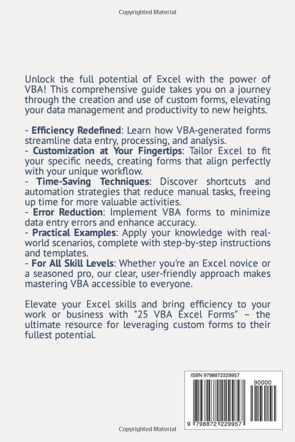 Welcome to the ultimate guide for Excel enthusiasts and data wizards! In “25 VBA Excel Forms,” we unlock the potential of Microsoft Excel to create not just spreadsheets but dynamic, interactive forms that simplify your work and empower your productivity. Unleash the Power of Excel Forms: This comprehensive paperback book dives deep into the world of Excel Forms, providing step-by-step instructions, code breakdowns, and endless customization options for 25 distinct forms. From simple data entry to sophisticated project management, you’ll discover how to make Excel Forms work for you. Highlights of What You’ll Find Inside: – In-Depth Code Demystification: We don’t just show you how; we teach you why. Understand the VBA code behind each form to become a true Excel master. – Tailored Customization: Take control of your forms with customization tips that let you adapt each form to your specific needs. – Excel Efficiency: These forms aren’t just for show. Learn how to streamline your tasks, collect and manage data effortlessly, and supercharge your Excel capabilities. Step into the World of VBA Excel Forms: With the clarity and precision of teaching style, this book makes complex Excel Forms easy to grasp. Whether you’re a seasoned pro or just starting, you’ll find invaluable insights and inspiration on every page. Unlock the full potential of Excel Forms and transform the way you work with data. Dive into “25 VBA Excel Forms” and unleash your Excel wizardry today! Get ready to conquer Excel like never before! Click Buy Now and embark on your journey to Excel mastery.