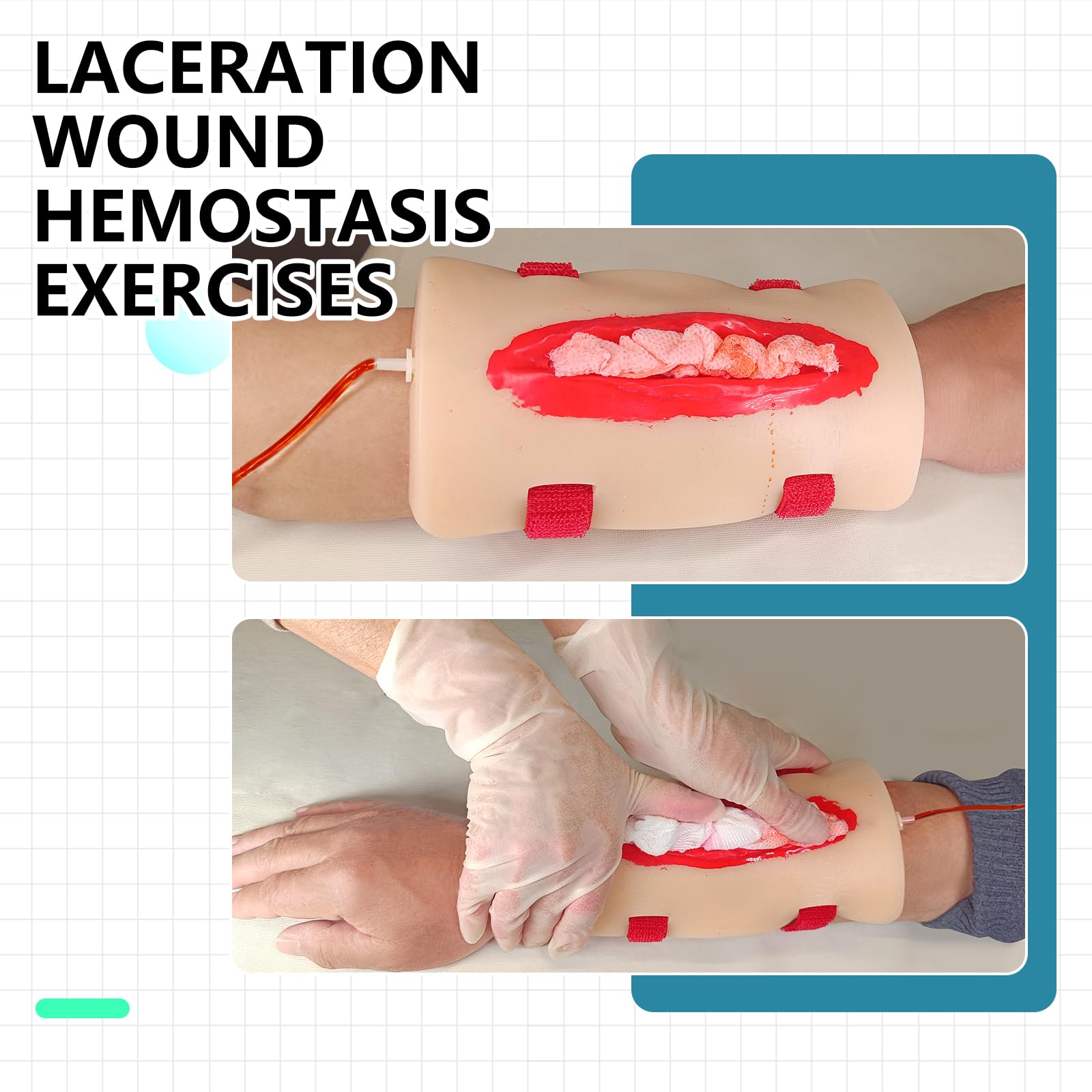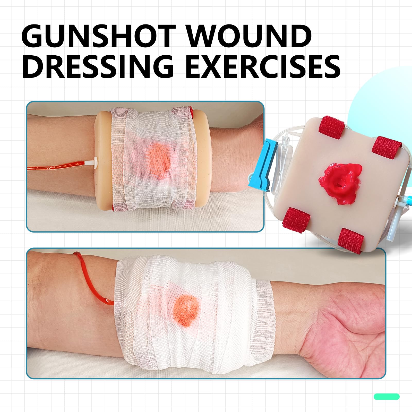 - [(Comprehensive Training)] The stop bleeding training kit includes essential components for wound treatment practice. By using the accompanying 1-liter water reservoir bag, you can pump blood simulant into the wounds to simulate realistic bleeding. Practice the procedures for cleaning and dressing wounds in emergency situations with tourniquet