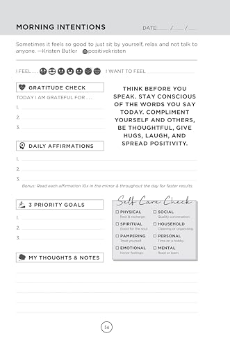 Good vibes in 3 minutes or less! This self-help book and journal all in one helps you train your mind for greater happiness in just minutes a day. With all the time we spend on our digital devices, it’s important to also have a practice of physically writing out our thoughts, feelings, intentions, reflections, goals, and wins. This 60-day best-selling guided journal shows you exactly how to put pen to paper to harness the power of positivity, train your mind, and change your life. Each entry is quick, yet powerful–only 3 minutes in the morning and 3 minutes in the evening–to keep you on track in 5 main areas: Habits Mindset Health Self-Esteem Success In addition todaily quotes, prompts, and activities, you’ll find recurring “check-ins” related to gratitude, affirmations, mental health, physical health, goals, and wins to help you feel more positive no matter what is happening around you. You’ll also find a thorough introduction to the practice of journaling for positivity, as Kristen Butler–founder of the Power of Positivity community, now 50 million strong–shares the tools and mindset strategies that helped her go from depressed and broke (literally broken) to happy, thriving, and whole. “I created this journal for change,” Kristen explains. “I created this journal for happiness. I created this journal for mental health based on how I have seen our community change lives.” The truth is, few people know exactly what it takes to set up their day to create happiness. It’s time to find out–and fall in love with the feeling of setting up and ending your day with positivity.