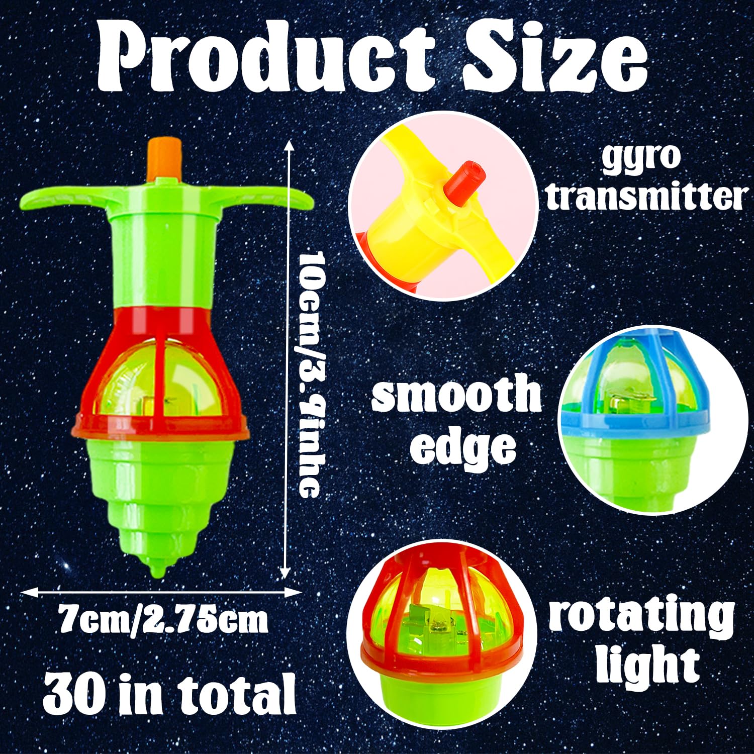 Packaing:Package includes 30 pcs LED light up spinning tops,each gyro has a handle and a gyroscope,small size and easy to hold