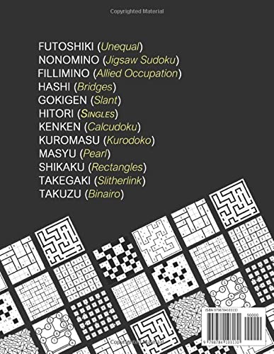 The logic challenge with Japanese puzzles is that each of them is a real brain teaser which makes them completely addictive and offer hours of puzzle fun! The puzzles keep your mind sharp, young and healthy and help you improve concentration and strengthen your memory. This book contains over 13 different styles of Japanese puzzles; 312 unique puzzles in total. Sudoku (Solo) Nonomino (Jigsaw Sudoku) Fillimino (Allied Occupation) Futoshiki (Unequal) Gokigen (Slant) Hashi (Bridges) Hitori (Singles) KenKen (Calcudoku) Kuromasu (Kurodoko) Masyu (Pearl) Shikaku (Rectangles) Takegaki (Slitherlink) Takuzu (Binairo) Go grab your copy today, for yourself or as a gift, and dive into the challenging, fun world of Japanese Brain Teasers!