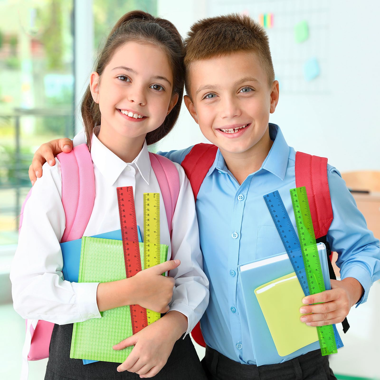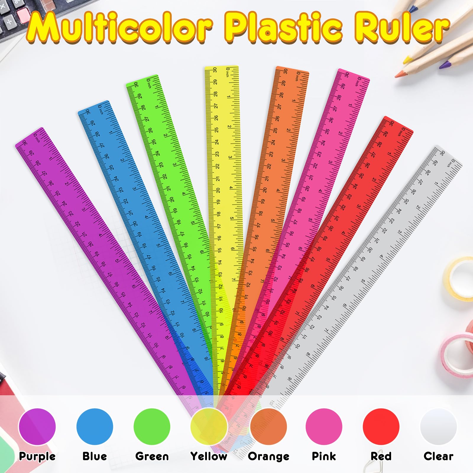 - Great Value Pack & Assorted Colors: Our rulers bulk includes 32 rulers, making it ideal for back-to-school and office bulk purchases. Each set comes in 8 vivid colors(4 of each color in blue, orange, pink, green, yellow, purple, red and clear), with a transparent design that allows a clear view of the underlying surface, combining practicality with aesthetic appeal.