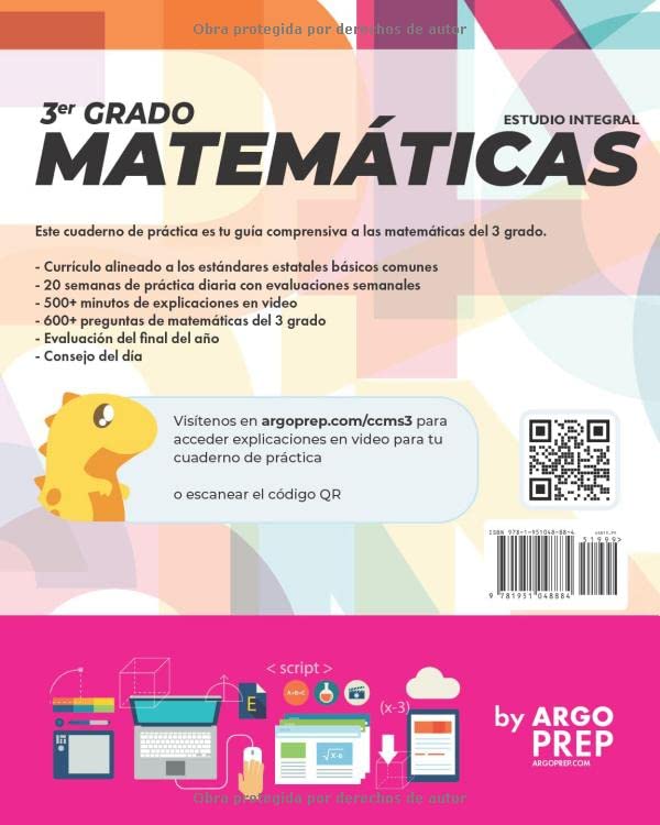 Este cuaderno de practica es tu guia comprensiva a las matematicas del 30 grado. Curriculo alineado a los estandares estatales basicos comunes 20 semanas de practica diaria con evaluaciones semanales 500+ minutos de explicaciones en video 600+ preguntas de matematicas del 30 grado Evaluacion del final del ano Consejo del dia Este libro tiene los siguientes temas tratados: Semana 1 – Valor posicional y redondeo Semana 2 – La suma y la resta de numeros enteros hasta 1,000 Semana 3 – Multiplicacion Semana 4 – Multiplicacion y divison Semana 5 – Cambiar oraciones de multiplicacion por division y vice versa Semana 6 – Propiedades conmutativas, asociativas y distributivas Semana 7 – Problemas del mundo real Semana 8 – Problemas de pasos multiples Semana 9 – Fracciones Semana 10 – Colocar fracciones en una recta numerica Semana 11 – La comparacion y ordenacion de fracciones Semana 12 – Decir la hora Semana 13 – La medicion Semana 14 – Graficas de barras y pictogramas Semana 15 – La medicion de largos & comprension de diagramas de puntos Semana 16 – Area Semana 17 – Problemas del mundo real Semana 18 – Area y perimetro Semana 19 – Caracteristicas de figuras Semana 20 – Fracciones y figuras Evaluacion de fin de ano Common Core Math Series de ArgoPrep ha sido cuidadosamente elaborado por maestros y educadores certificados por el estado para brindarle a su hijo contenido y materiales de alta calidad para mejorar sus puntajes en 3er grado. Ademas, todos nuestros libros de trabajo vienen equipados con explicaciones en video a las que puede acceder de forma gratuita en nuestro sitio web. Este cuaderno de practica se disena para dar mucha practica con los estandares estatales comunes (CCSS por sus siglas en ingles). Al practicar y dominar este cuaderno de practica por completo, su hijo se familiariza y se pondra bastante comodo con el examen estatal de matematicas. Si usted es maestro o maestra que esta utilizando este cuaderno de practica para sus estudiantes, se dara cuenta de que cada pregunta se etiqueta con el estandar especifico para poder facilmente asignarles a sus estudiantes los problemas de este cuaderno de practica. Este cuaderno maneja los estandares estatales comunes (CCSS por sus siglas en ingles) y los reparte entre 20 semanas. Al trabajar en estos problemas a diaraio, los estudiantes podran (1) encontrar las deficiencias en su comprension y/o practica de las matematicas y (2) experimentar pequenos exitos cada dia que reforzara el dominio y la confianza en sus habilidades. Le recomendamos enfaticamente que vea los videos debido a que fortaleceran los conceptos fundamentales. Favor de notar que quizas sea necesario tener hojitas de papel durante el uso de este cuaderno para que el estudiante tenga suficiente espacio para demostrar su trabajo. ArgoPrep es uno de los principales proveedores de productos educativos complementarios y ha recibido mas de 15 premios educativos solo el ano pasado. !Dale a tu hijo la educacion que se merece!