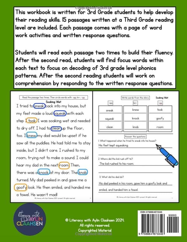 This workbook directly supports literacy development by providing targeted practice in 3rd-grade level phonics, reading fluency, and comprehension.