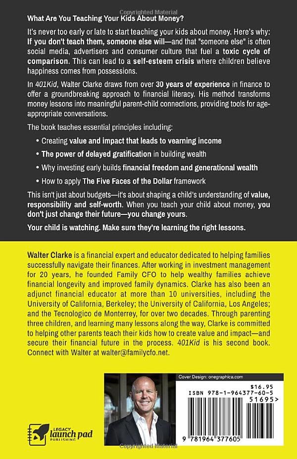 What Are You Teaching Your Kids About Money? It’s never too early or late to start teaching your kids about money. Here’s why: If you don’t teach them, someone else will and that “someone else” is often social media, advertisers and consumer culture that fuel a toxic cycle of comparison. This can lead to a self-esteem crisis where children believe happiness comes from possessions. In 401Kid, Walter Clarke draws from over 30 years of experience in finance to offer a groundbreaking approach to financial literacy. His method transforms money lessons into meaningful parent-child connections, providing tools for age-appropriate conversations. The book teaches essential principles including: Creating value and impact that leads to earning income The power of delayed gratification in building wealth Why investing early builds financial freedom and generational wealth How to apply The Five Faces of the Dollar framework This isn’t just about budgets–it’s about shaping a child’s understanding of value, responsibility and self-worth. When you teach your child about money, you don’t just change their future–you change yours. Your child is watching. Make sure they’re learning the right lessons.