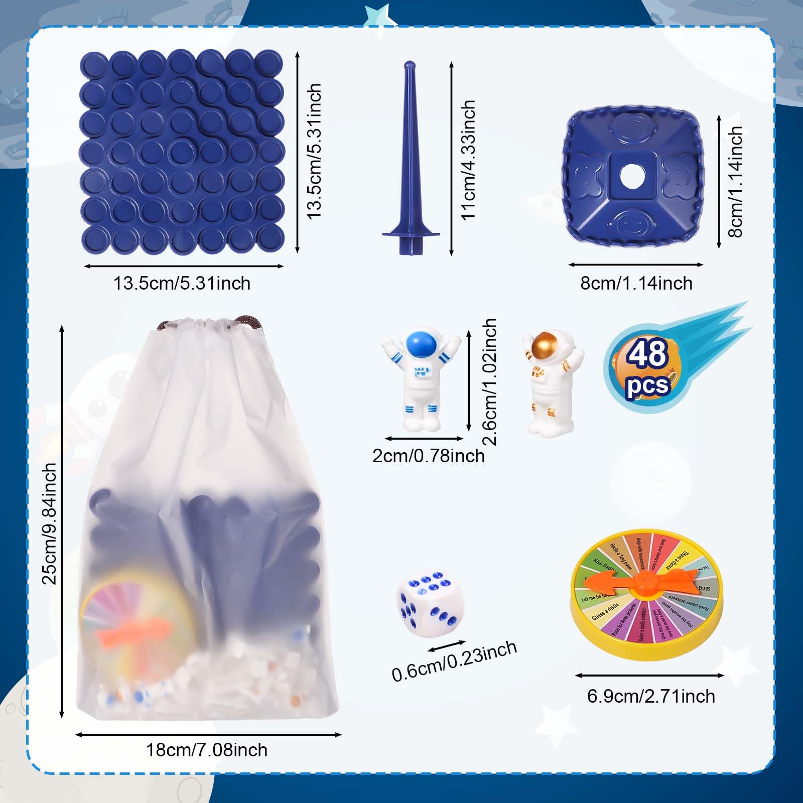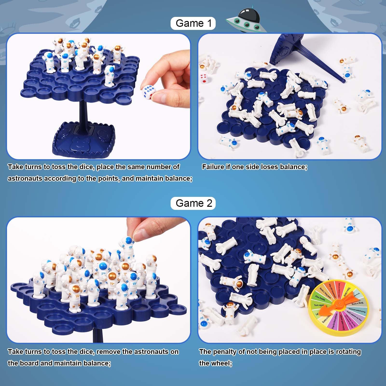 Specification: Main Color: blue Material: ABS Product Size: balanced base: 5.3×5.3×4.7 inch/13.5×13.5x12cm Package Details: 48 x astronauts 1 x balanced base 1 x dice 1 x storage bag 1 x penalty turntable Note: Due to manual measurement, the size and weight may have a certain error. Due to the difference between different monitors, there may be a slight color difference existed.