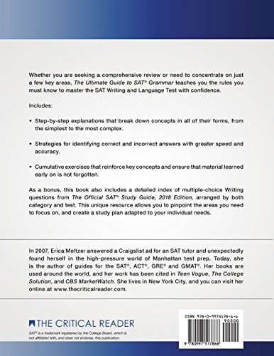 A newer edition of this item is available: https://www.amazon.com/Fifth-Ultimate-Guide-SAT-Grammar/dp/1733589538/ The fourth edition of The Ultimate Guide to SAT Grammar provides comprehensive coverage of all the grammar and rhetoric tested on the redesigned SAT Writing and Language Test. Dozens of exercises help students move from studying concepts individually to applying their skills in a passage-based context. Includes a complete index of Writing questions from the eight exams in the College Board Official SAT Study Guide, 2018 Edition, arranged both by category and by test.