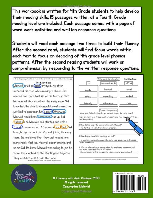 This workbook directly supports 4th-grade level reading skills through targeted phonics passages and comprehension exercises.