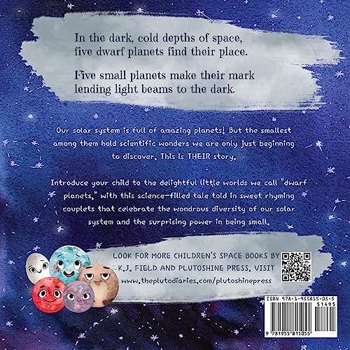 A playful, science-packed introduction to Pluto and the dwarf planets told in sweet rhyming couplets. Introduce the solar system’s five dwarf planets to children ages 3-8 with this fun planetary tale that proves small planets can shine just as bright as big ones. In the dark, cold depths of space five dwarf planets find their place. Five small planets make their mark lending light beams to the dark. Our solar system has amazing planets! But the smallest among them hold scientific wonders we are only just beginning to understand. This is THEIR story. Introduce your child to the delightful little worlds we call “dwarf planets” with this science-filled tale told in rhyming verse that celebrates the wondrous diversity of our solar system and the surprising power in being small. Makemake blushing red rounds the Sun full speed ahead. Ninety million miles to go, no such thing as “take it slow.” A rhyming storyline and playful watercolor illustrations of Pluto and his dwarf planet friends Haumea, Ceres, Makemake, and Eris will inspire any young child who’s ever dreamed of space. Bonus science facts on each page provide context for the rhymes, as well as additional information. Children are sure to come away from the story counting the loveable dwarf planets as newfound friends and wanting to learn more about our incredible universe. Ideal for toddlers, preschoolers, kindergarteners, and early elementary-school-age children up to age 8 who love outer space! This dwarf-planet picture book for kids features: Vibrant, joyful watercolor illustrations that bring space concepts alive Playful rhymes & storyline that introduce the five dwarf planets and their special features Bonus science facts on every page that provide context for the rhymes and additional information Plenty of astronomy and space science expressed in simple ways children can understand Sweet message about the ability of small planets to shine just as bright as big ones Little Pluto rose to fame by not doing things the same: Heart that spans a thousand miles Brightening space and human smiles. Expand your child’s knowledge of the solar system with this fun-filled focus on the little planets that populate our solar system! Want to learn even more about dwarf planets? Check out My First Book of Dwarf Planets, a nonfiction children’s astronomy book filled with beautiful and inspiring space photos and in-depth but easy-to-understand information about our solar system’s amazing dwarf planets!