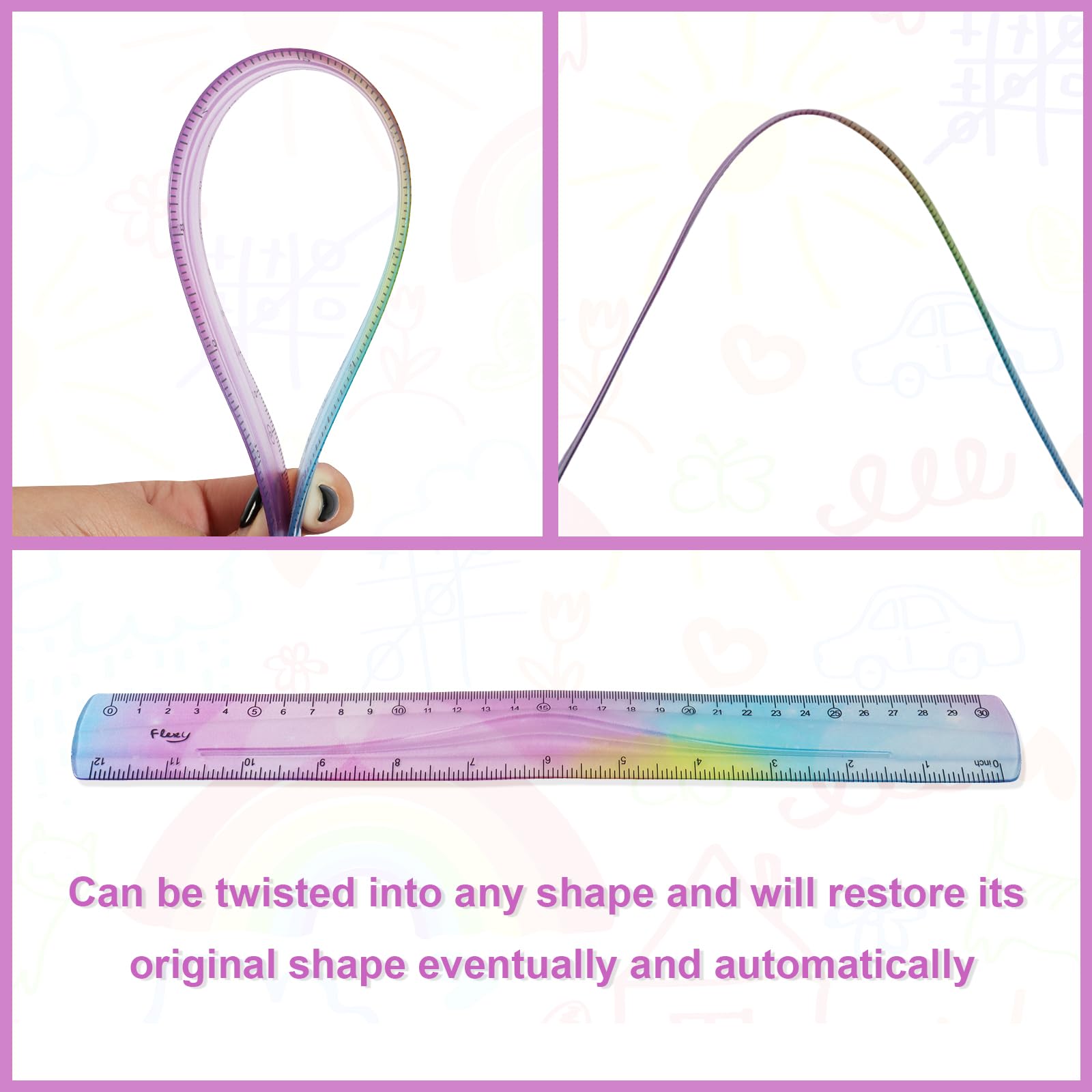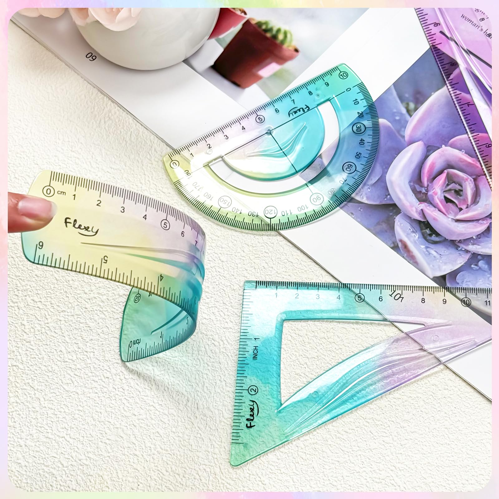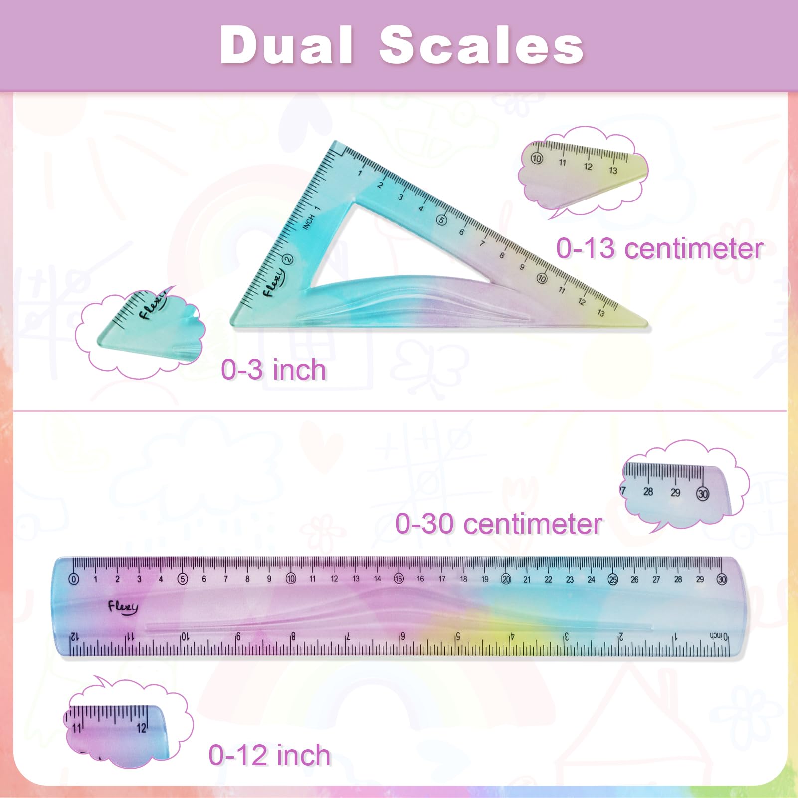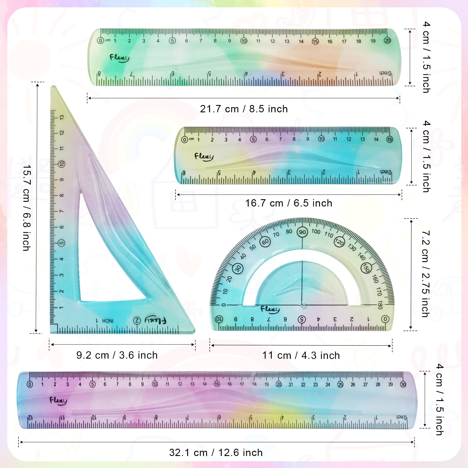 - Package Includes: 5 Gradient Flexible Rulers: 2 Straight Rulers (30cm/12inch & 20cm/8inch) and 1 Geometric Ruler Set (Triangular Ruler, Straight Ruler, Protractor)