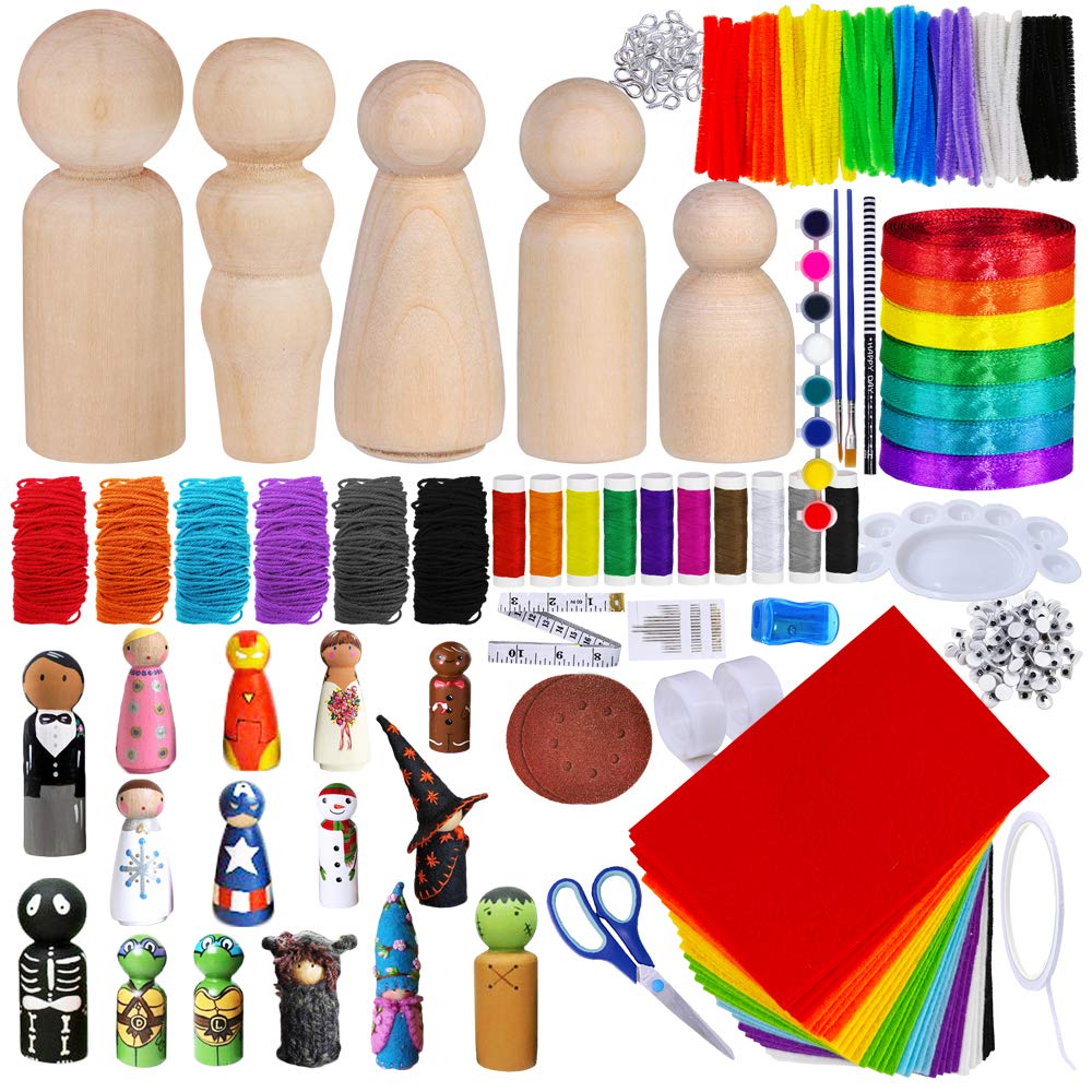 - Assorted Unfinished Wooden Peg Doll Bodies Family Doll Bodies Craft Kit includes 50 Pcs 5 Shapes Wooden Peg Doll Bodies, 56 Pcs 8 Colors Soft Felt Sheets, 120 Pcs 8 Colors Plain Pipe Cleaners, 120 Pcs Wiggle Googly Eyes, 6 Rolls 6 Colors Yarn, 7 Rolls 7 Colors Satin Ribbon, 1 Set of Paints , 1 Paint Palette Tray, 1 Pencil, 1 Sharpener, 2 Pcs Sanding Discs, 1 Set Sewing Threads (10 rolls), 1 Set Needles, 1 Scissor, 1 Measuring Tape, 1 White Washi Tape and 2 Rolls adhesive dots.
