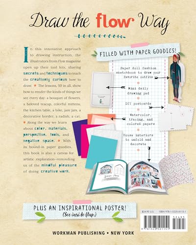 The mindful pleasure of learning to draw, with paper goodies and creative secrets from expert illustrators. Draw the Flow way. In this innovative approach to drawing instruction, the illustrators from Flow magazine open up their tool kits, sharing secrets and techniques to teach the creatively curious how to draw. And paper goodies bound into the book encourage artistic exploration and remind us of the mindful pleasure of doing creative work. The lessons, 50 in all, show how to render the kinds of things we see every day: a bouquet of flowers, a beloved teacup, colorful mittens, the kitchen table, a bike, jam jars, a cat, an apple tree. Along the way we learn about color, materials, perspective, tools, and negative space. Filled with paper goodies: Paper doll fashion sketchbook to draw your favorite outfits Mini daily drawing pad DIY postcards Watercolor, tracing, and colored papers House interiors to unfold and decorate
