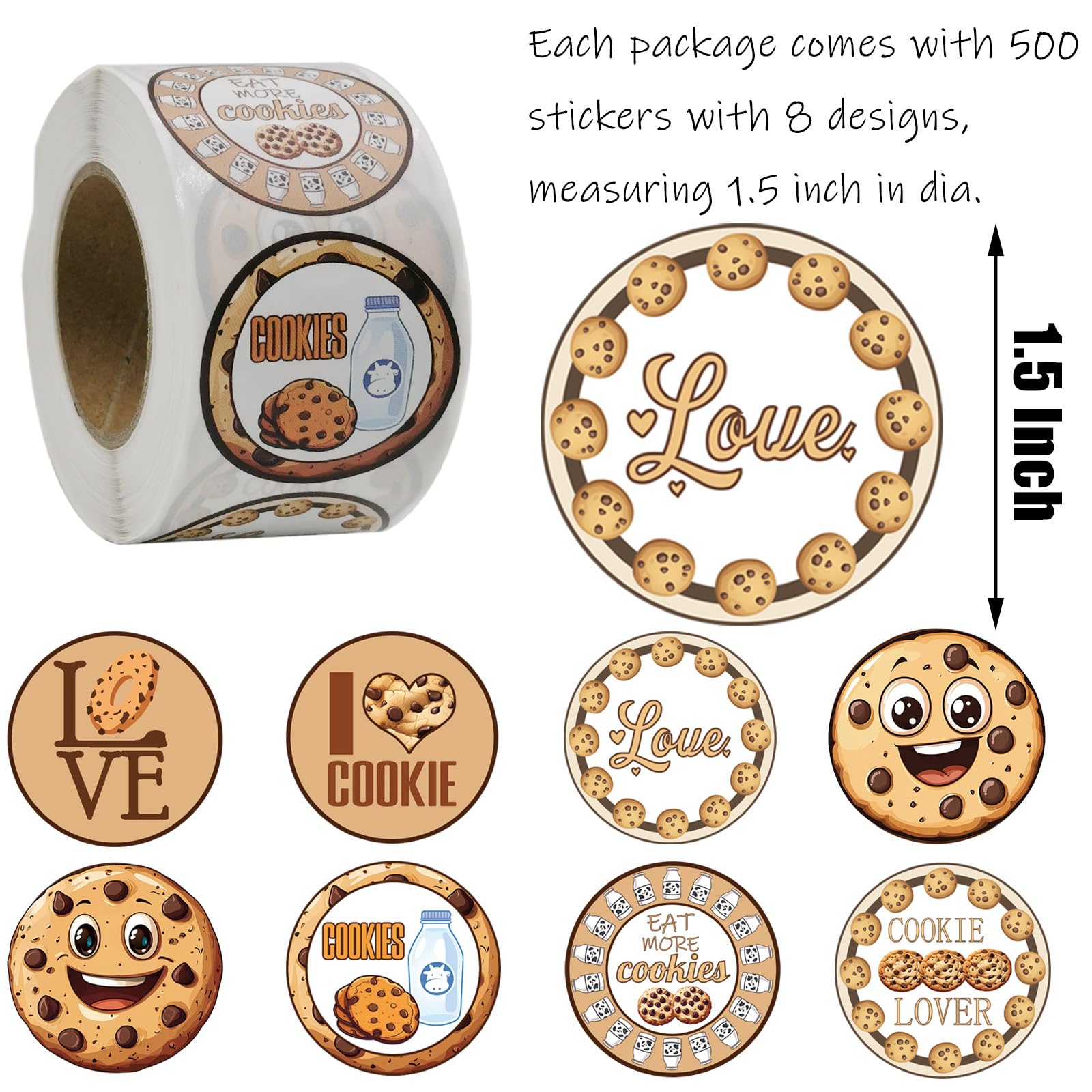- Sweet & Versatile Designs – 500 charming 1.5″ round cookie stickers featuring classic chocolate chip, sugar cookies and decorative patterns – perfect for enhancing tea parties, cafe packaging or event favors.