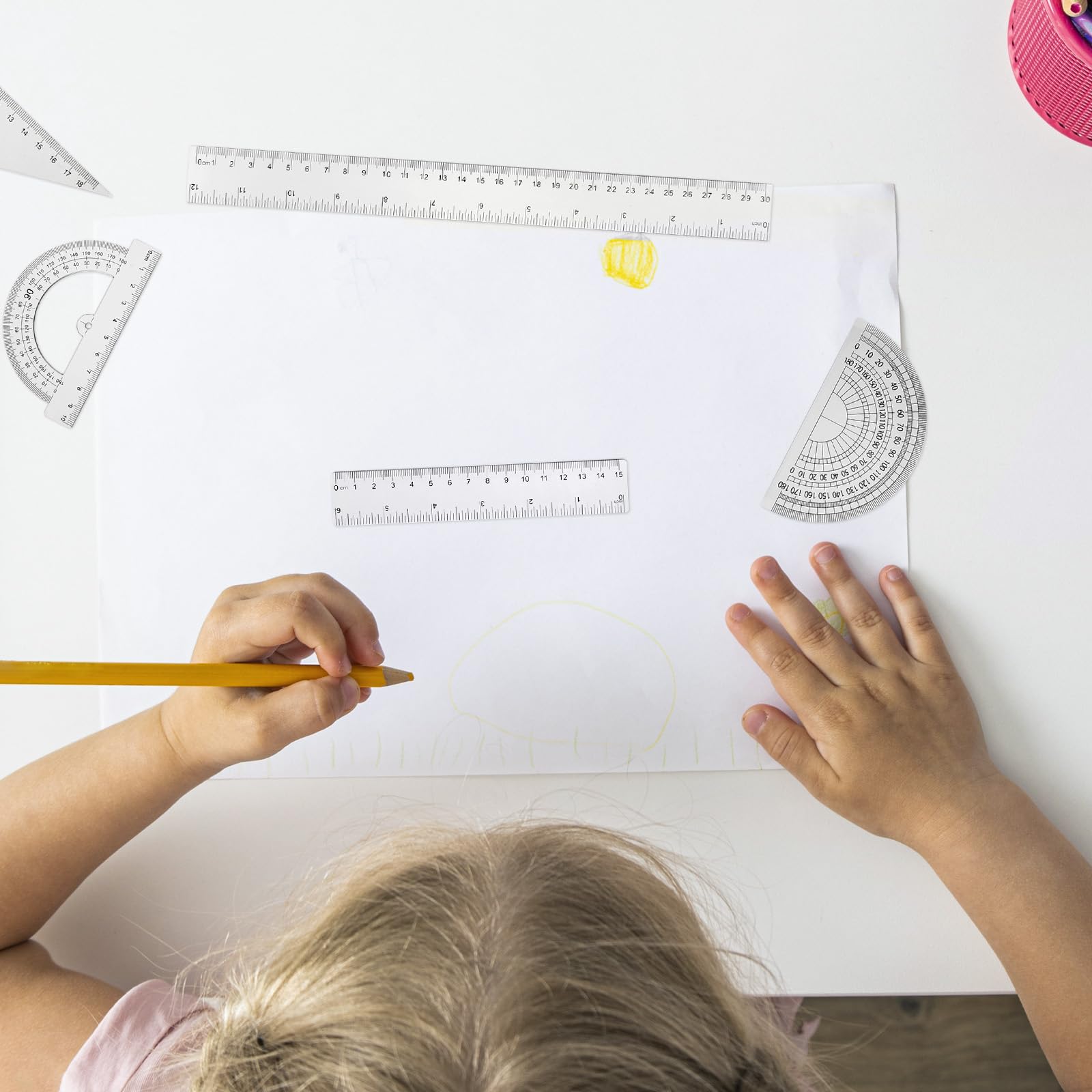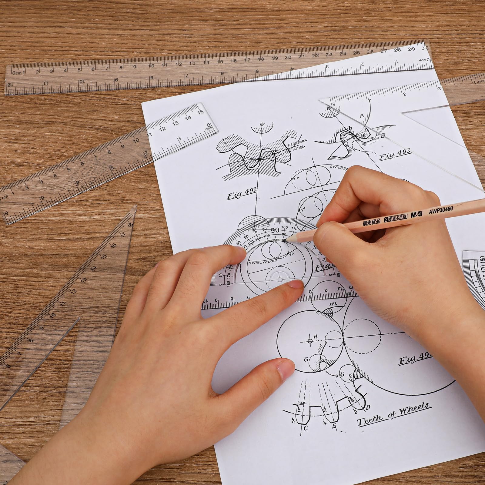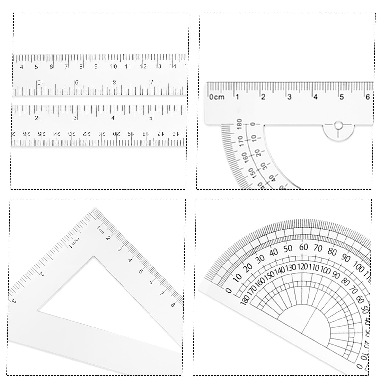 - [(Easy to Use)] The math ruler is transparent, so it won’t obstruct your view when you use it, you can clearly see the numbers, words and lines on the page. Besides, there is a hole at the bottom of the hollow type protractor, which is nice for locating the point of the figure and drawing geometric figures with different angles.