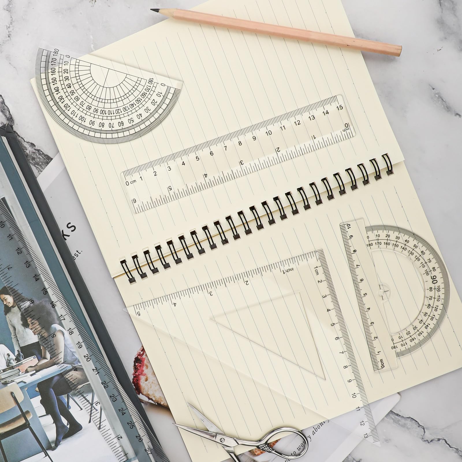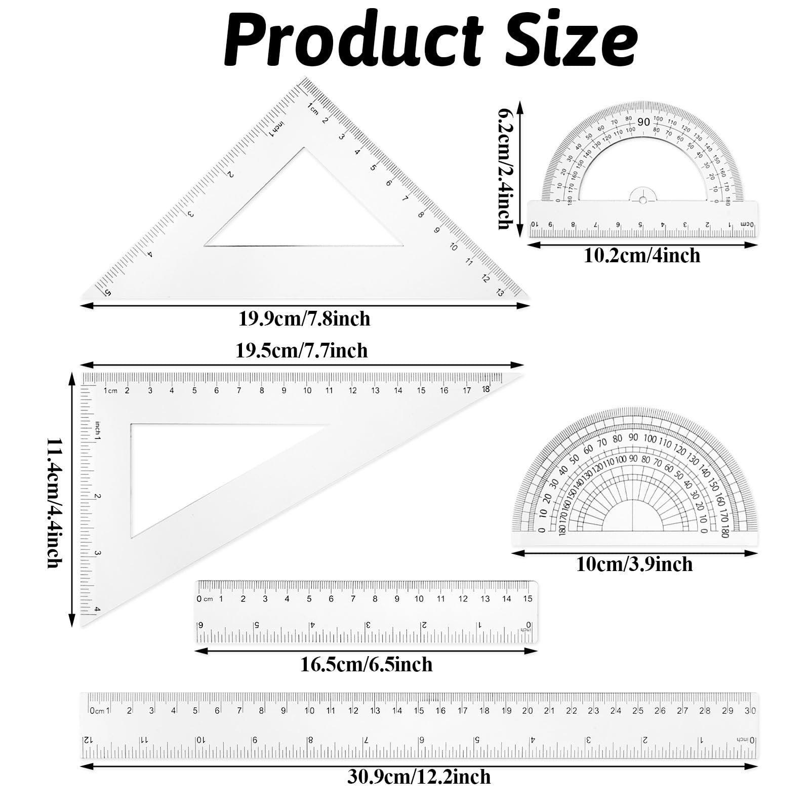 - [(Quality Material)] This clear math geometry set is made of high-quality plastic, printed with both metric and imperial scales, lightweight, portable and durable. The transparent material makes the sacle clearer, not easy to fade, this clear plastic ruler will be your parctical measuring tool.