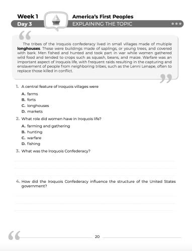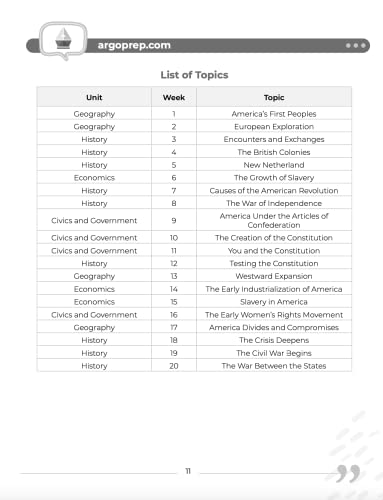 Build Social Studies Mastery the Smart Way! 7th Grade Social Studies Daily Practice Workbook Aligned to State Standards and the Next Generation Learning Standards From ArgoPrep — Award-Winning Education for Families Who Want More Give your child or students the tools they need to explore history, government, geography, and economics with confidence. The 7th Grade Social Studies Daily Practice Workbook by ArgoPrep offers 20 weeks of thoughtfully designed practice to build strong foundational knowledge and real-world critical thinking skills. Using ArgoPrep’s proven 5E approach, students don’t just memorize facts — they engage with the material, explore ideas, explain concepts, experiment through simple activities, and elaborate on their understanding. This interactive method ensures students truly master what they learn. How Students Will Learn with ArgoPrep’s 5E’s: Engage: Read a short, focused text and answer multiple-choice questions. Explore: Dive deeper by collecting, analyzing, and interpreting information. Explain: Draw conclusions and make sense of the topic through writing and reflection. Experiment: Apply knowledge through hands-on, easy-to-implement activities. Elaborate: Synthesize information, reflect critically, and evaluate results. Each week targets essential 7th Grade Social Studies skills, helping students connect past events to today’s world and preparing them for future academic success. Topics Covered Include: America’s First Peoples European Exploration Encounters and Exchanges The British Colonies New Netherland The Growth of Slavery Causes of the American Revolution The War of Independence America Under the Articles of Confederation The Creation of the Constitution You and the Constitution Testing the Constitution Westward Expansion Early Industrialization in America Slavery in America The Early Women’s Rights Movement America Divides and Compromises The Crisis Deepens The Civil War Begins The War Between the States ArgoPrep’s Social Studies workbook is fully state-aligned and supports Next Generation Learning Standards, making it a trusted tool for both homeschool and classroom learning. Why Families and Educators Trust ArgoPrep: Forbes 30 Under 30 in Education Honoree Mom’s Choice Award Recipient National Parenting Products Award Winner Seal of Approval from Homeschool.com Tillywig Brain Child Award Winner Parent’s Choice Gold Medal Winner Winner of 15+ National Educational Awards At ArgoPrep, we are committed to delivering the highest quality educational resources. If you have any questions, suggestions, or need additional support, feel free to reach out to us anytime at [email protected]. ArgoPrep — Where Learning Meets Confidence.