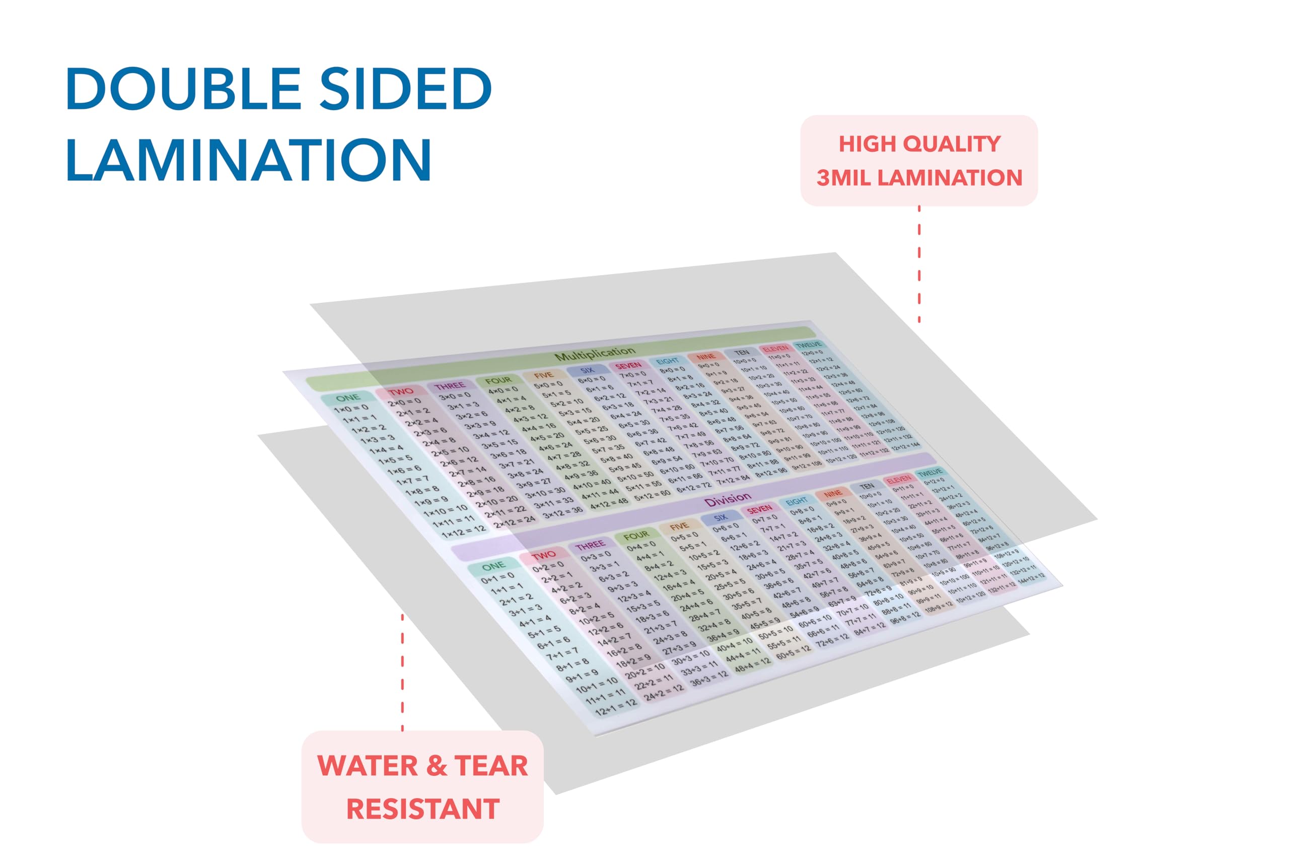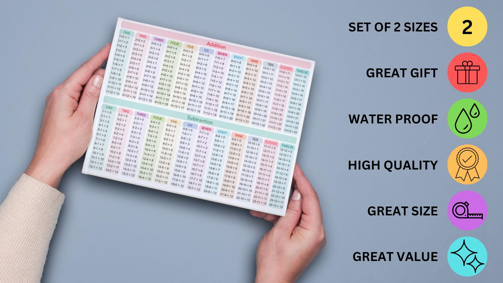 Transform your learning space with these comprehensive math table charts designed for students and educators alike. The set includes a full-sized 8.5 x 11 inch laminated chart perfect for classroom walls or study areas, plus a convenient 4×6 inch pocket version for on-the-go reference. These durable charts feature essential mathematical operations including multiplication, division, addition, and subtraction tables – fundamental tools for building strong arithmetic skills. The laminated finish ensures these charts withstand daily use while remaining clear and legible. Whether you’re a teacher seeking classroom resources or a parent supporting homeschool learning, these charts serve as valuable visual aids for mathematics education. The portable pocket size version is perfect for quick reference during homework or test preparation, while the larger chart provides excellent visibility for group learning sessions. Help students master basic math operations with these practical and long-lasting educational tools.