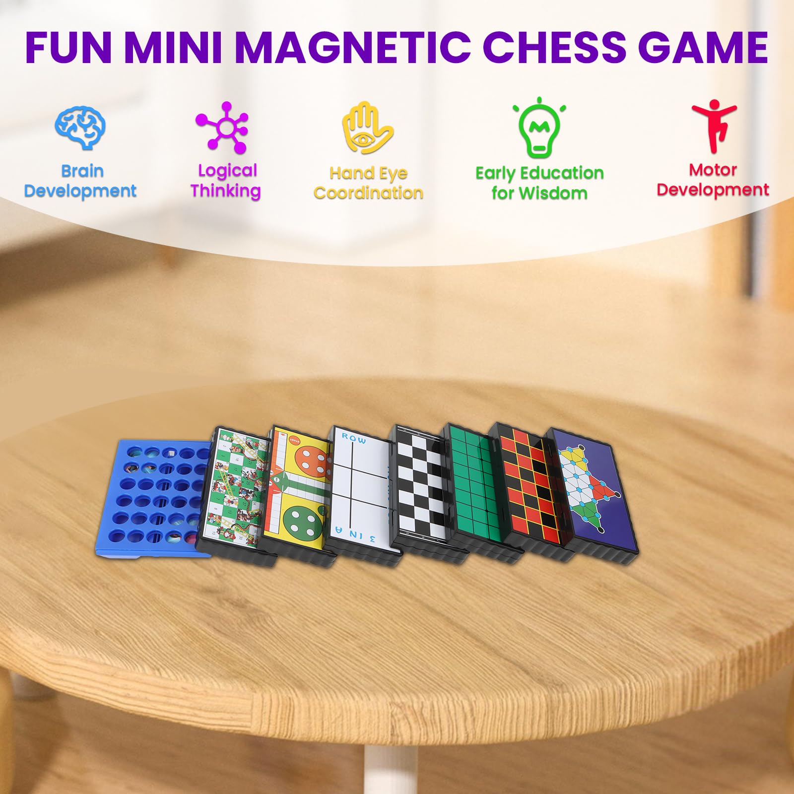 - [(Ideal Magnetic Board Games Gift)] This 8 in 1 Mini Magnetic Chess Game Set will be a great present on all kinds of festivals, Suitable for family gathering, school activities, company party, camping, traveling etc., Rich and varied games will bring more fun and improve our Brain Development, Hand Eye Coordination, Logical Thinking, Motor Development through the playing
