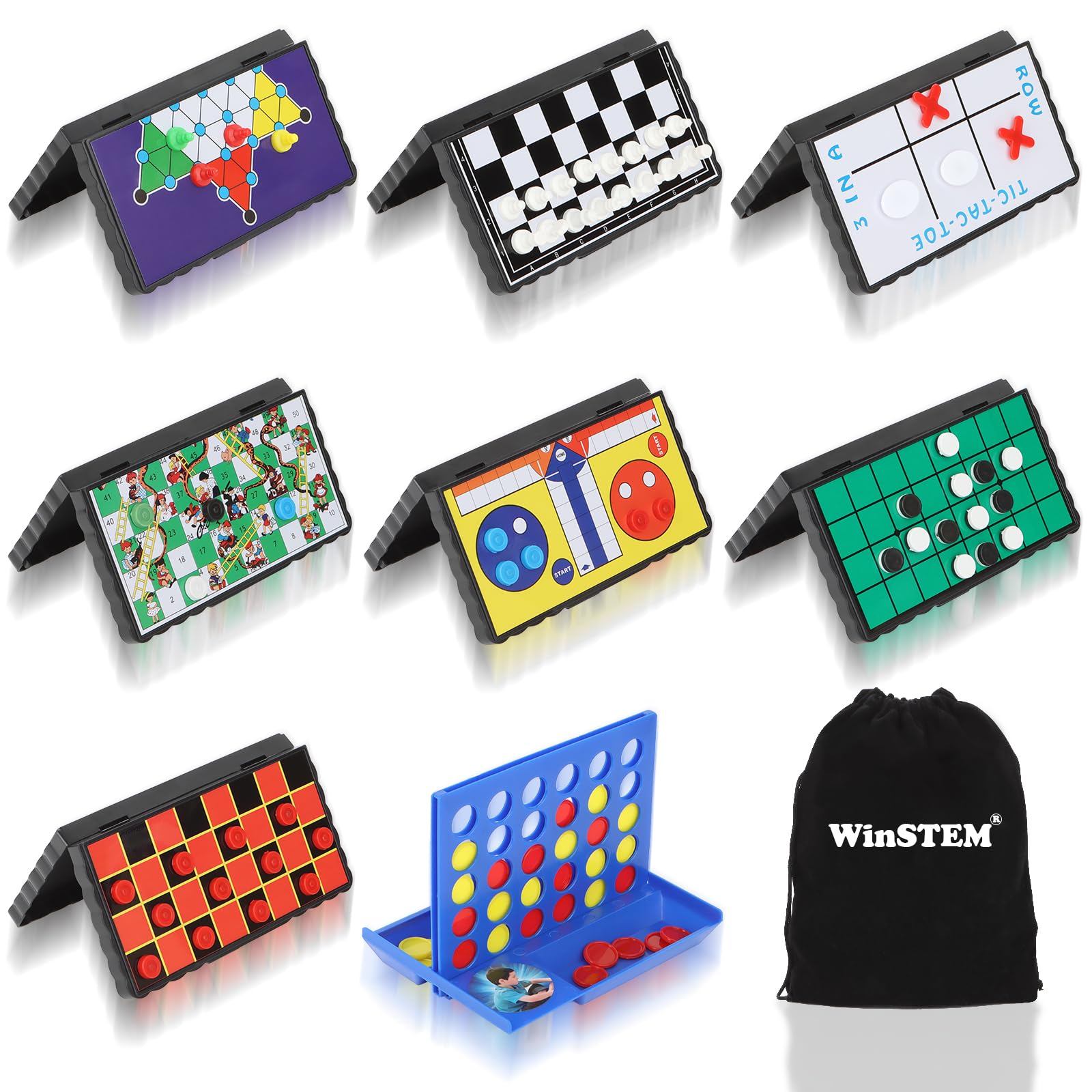 - [(8-in-1 Mini Travel Game Set)] This mini folding travel board game includes Eight classic games in one! Mini Chess, Checkers, Reversi, Tic Tac Toe, Chinese Checkers, Snakes and Ladders board game, 4 in a Row Game, and Ludo. It comes with basic instructions for each game. You could get a lot of fun from this small strategic board game