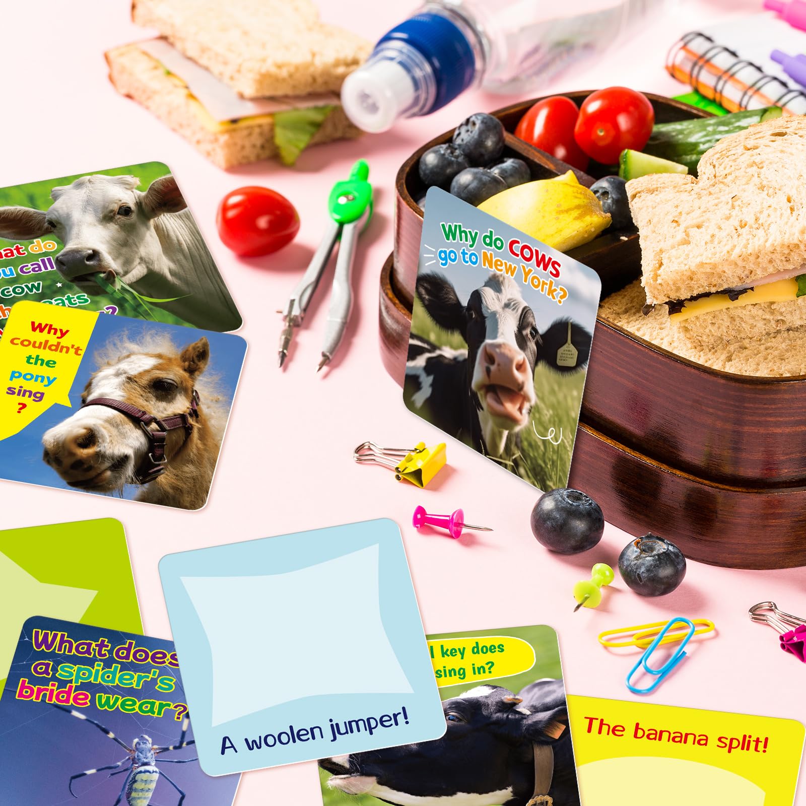Package Includes: 80 cute lunch box joke cards; Each measures 3.4 X 3.4 inches