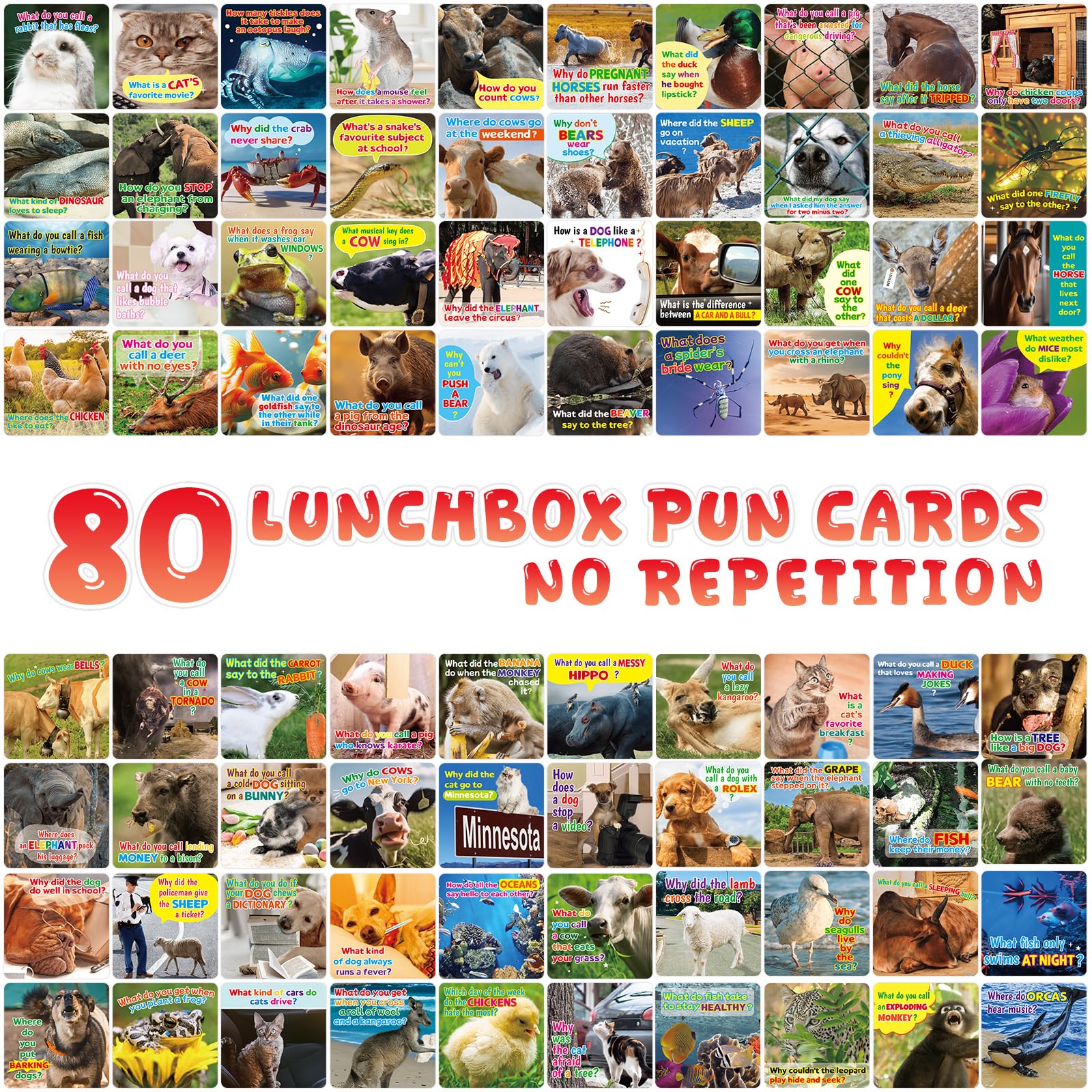 80Pcs Joke Cards for Kids Lunchbox Notes Motivational Inspirational Notes Cards with Funny Animal Puns for Boys Girls Teens School Camp Picnic Party Supplies