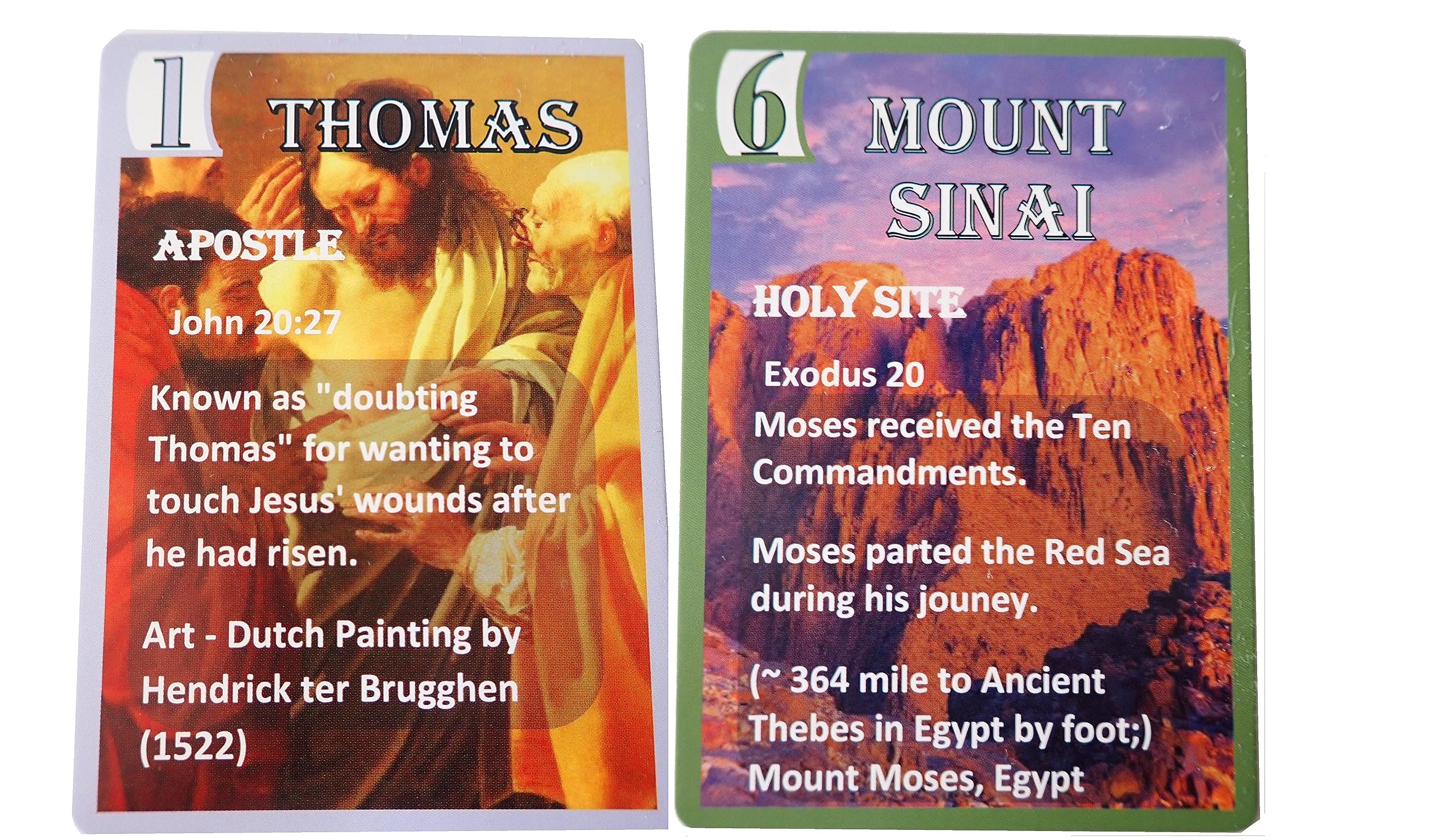 - DESCRIPTION – Cards are beautiful pictures of artwork of the Apostles, Villains, Notable Characters, and Holy Sites of the bible. Each card has a description or interesting fact about the person or place, verse in the bible, and artist information. Very educational but this is NOT a Bible trivia game.