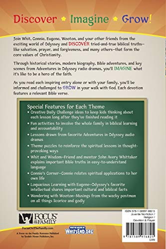 Written by the Adventures in Odyssey team, 90 Devotions for Kids provides fun, Bible-based devotions for families and will encourage children to spend time learning more about God. There are no better mentors than Whit and the folks from Odyssey to partner with parents as they teach their children about God’s Word and make the truths of the Bible accessible to their kids. AIO’s 90 Devotions for Kids includes thirteen weeks of devotions. Sidebars from Odyssey favorites Wooton, Whit, Connie, and Eugene provide friendly suggestions for life applications. Each week has an individual theme and will include an overview to introduce the theme, seven devotions that reference AIO dramas, and an activity, puzzle, or game to reinforce the core biblical truths taught during the week. Parents will find the tools they need to help start children on a path toward regular time alone with God, and families will be encouraged to spend time together as they share the daily readings.