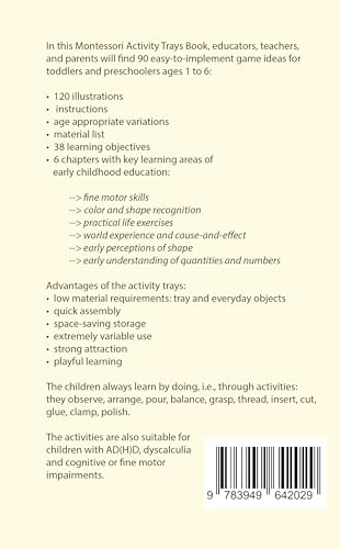 In this Montessori Activity Book, educators, teachers, and parents will find 90 easy-to-implement game ideas for toddlers and preschoolers ages 1 to 6: * 120 illustrations * instructions * age appropriate variations * material list * 38 learning objectives * 6 chapters with key learning areas of early childhood education: –> fine motor skills –> color and shape recognition –> practical life exercises –> world experience and cause-and-effect –> early perceptions of shape –> early understanding of quantities and numbers Advantages of the activity trays: * low material requirements: tray and everyday objects * quick assembly * space-saving storage * extremely variable use * strong attraction * playful learning The children always learn by doing, i.e., through activities: they observe, arrange, pour, balance, grasp, thread, insert, cut, glue, clamp, polish. The activities are also suitable for children with AD(H)D, dyscalculia and cognitive or fine motor impairments.