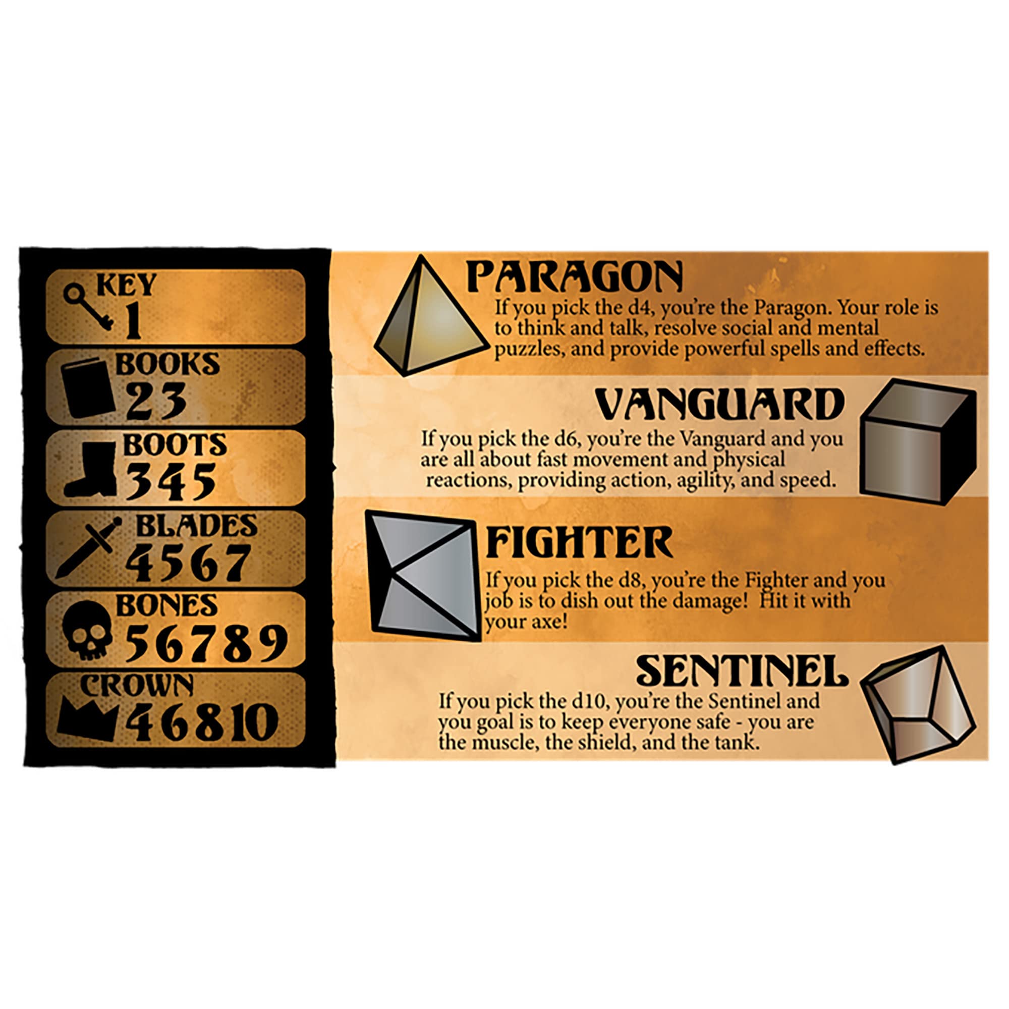- Whenever a player asks “can I do something?” they roll their die and with a quick glance at a resolution matrix, know if they succeed……or failed.