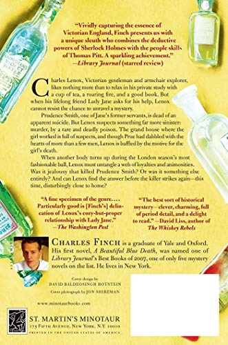 Equal parts Sherlock Holmes and P.G. Wodehouse, Charles Finch’s debut mystery A Beautiful Blue Death introduces a wonderfully appealing gentleman detective in Victorian London who investigates crime as a diversion from his life of leisure. Charles Lenox, Victorian gentleman and armchair explorer, likes nothing more than to relax in his private study with a cup of tea, a roaring fire and a good book. But when his lifelong friend Lady Jane asks for his help, Lenox cannot resist the chance to unravel a mystery. Prudence Smith, one of Jane’s former servants, is dead of an apparent suicide. But Lenox suspects something far more sinister: murder, by a rare and deadly poison. The grand house where the girl worked is full of suspects, and though Prue had dabbled with the hearts of more than a few men, Lenox is baffled by the motive for the girl’s death. When another body turns up during the London season’s most fashionable ball, Lenox must untangle a web of loyalties and animosities. Was it jealousy that killed Prudence Smith? Or was it something else entirely? And can Lenox find the answer before the killer strikes again–this time, disturbingly close to home?